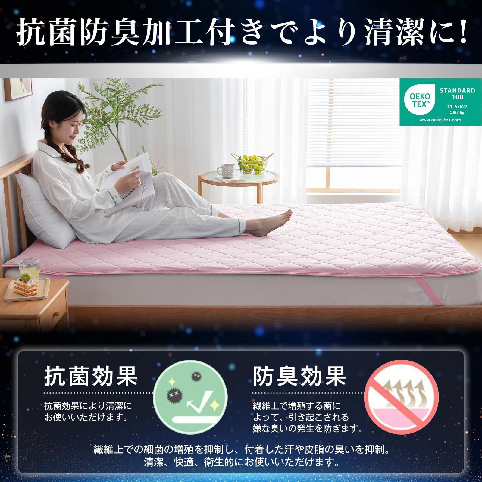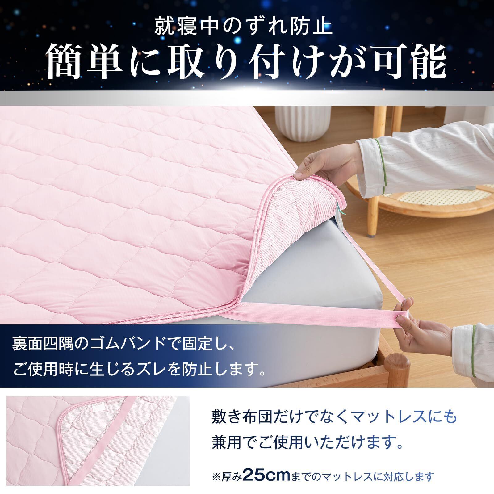【四隅にゴムバンド付き】四隅にはズレ防止の強化ゴムバンド付きなので、寝返りでもずれにくく、使用中にズレるストレスを軽減します。ベッド/マットレス/敷き布団にしっかり固定して、朝まで安心してお休みいただけます。お手持ちの敷布団、ベッドマットレスに簡単に着脱、取り外しできます。