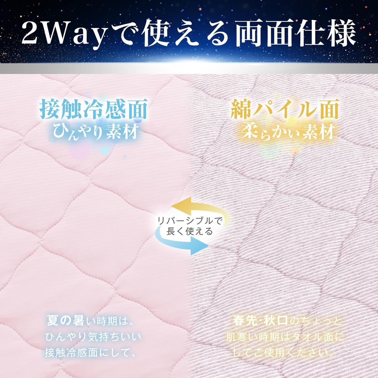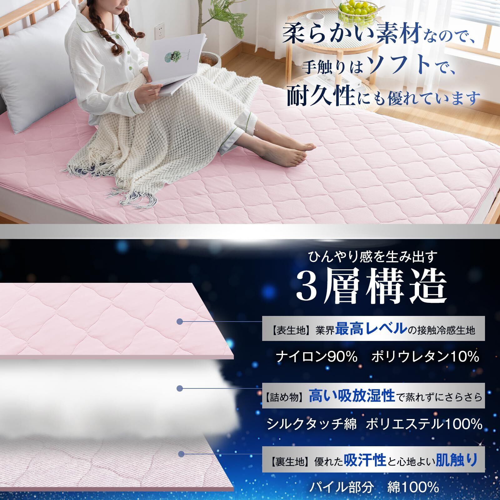 【両面使える】表地にはひんやり心地よい接触冷感素材を、中綿は超柔らかいシルクタッチ綿を使用しています。肌触りが柔らかいです。裏地は吸湿性に優れたタオル地を使用しています。蒸し暑い夏はさわってひんやり接触冷感面、少し寒い春秋、じめじめした日は、通気性が優れたパイル綿生地、肌触りが良いタオル面で使用します。コットンタオルの生地は汗や湿気を吸い取ってくれるので、さらっと快適な寝心地に導いてくれます。また、パイル生地はほぼ一年中ご使用いただくことができるのでとってもお得です。