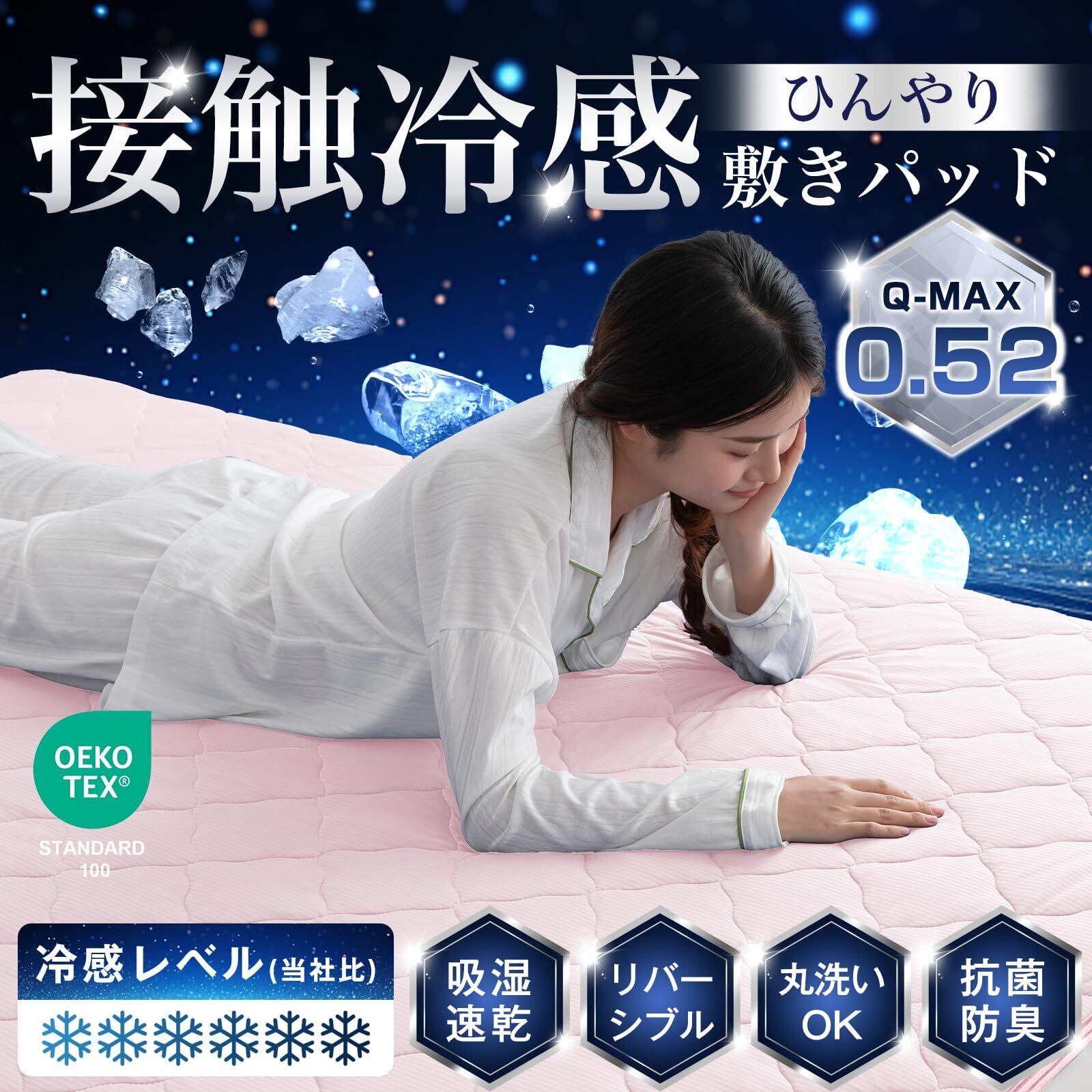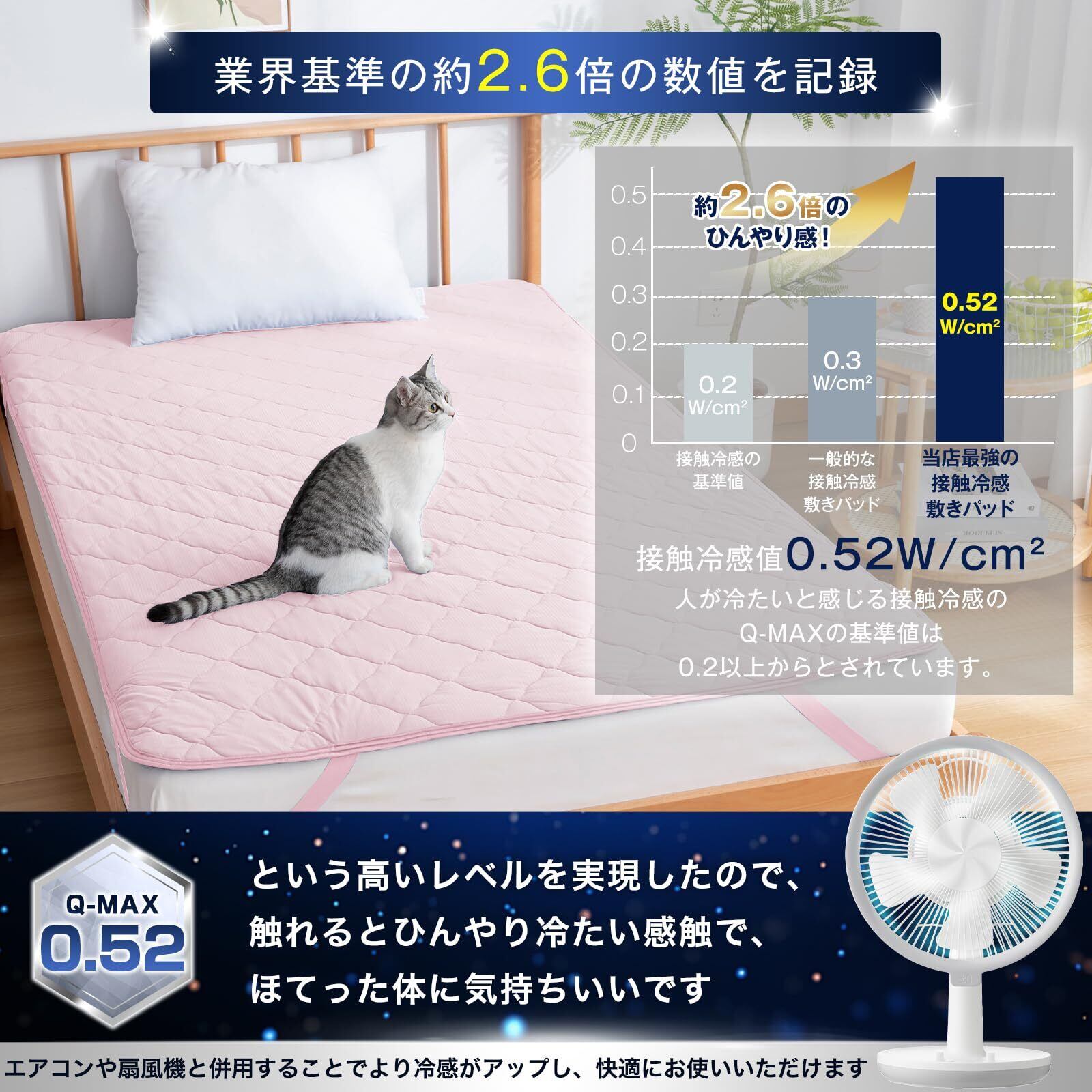 【ひんやり冷感敷きパッド】熱伝導率の高い素材を使った接触冷感敷きパッド。Q-MAX0.52以上ので、触れるとひんやり涼しく感じます。寝返りのたびにひやっとして気持ちよく、肌の熱を吸収してくれるので、暑い夜も快適にお使いいただけます。より涼しく心地良いやさしい肌触りで速乾性にも優れています。