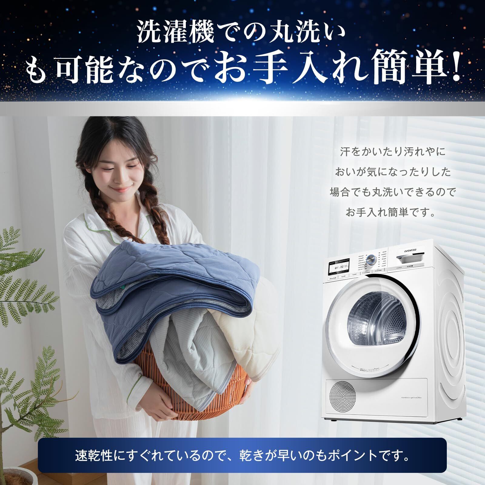 【洗濯機で丸洗いOK 】敷きパッド、枕パッド共にご自宅でお洗濯が可能です。汗ばむ季節に活躍する接触冷感の敷きパッドだからこそ気軽にじゃぶじゃぶ洗えていつでも清潔。汗をかいたり汚れやにおいが気になったりした場合でも丸洗いできるのでお手入れ簡単です。乾きやすく、シワになりにくい生地なのも嬉しいポイントです。