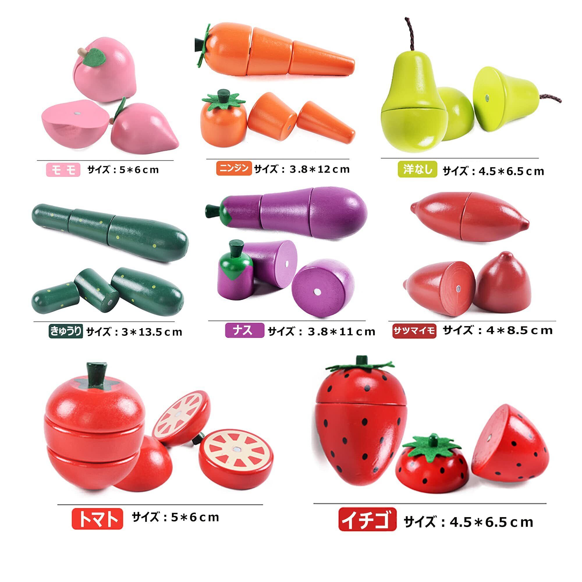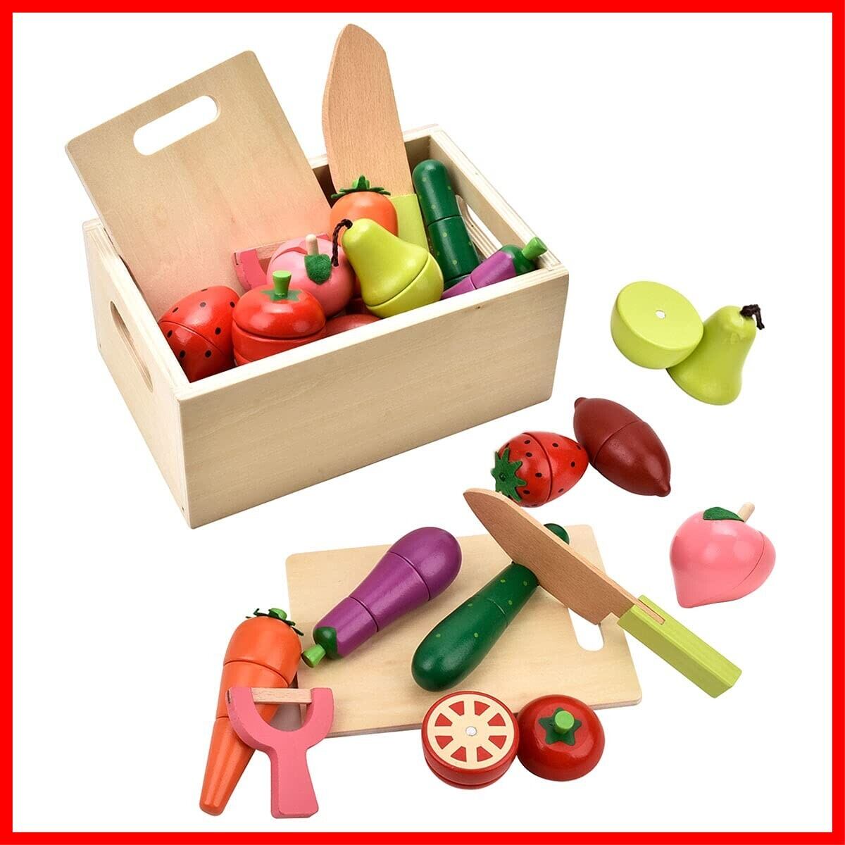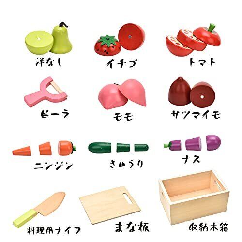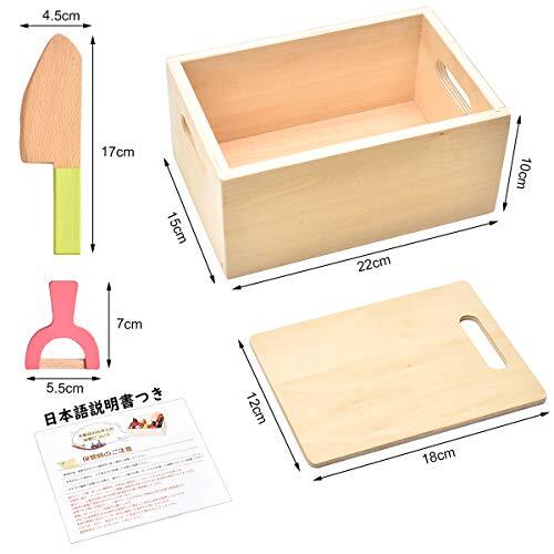 付属の包丁でサクッと切れて木の重さが心地いい。おままごと遊び定番の野菜や果物、包丁やまな板、お片づけに便利な木箱も一緒に入った大変お得なセットです。