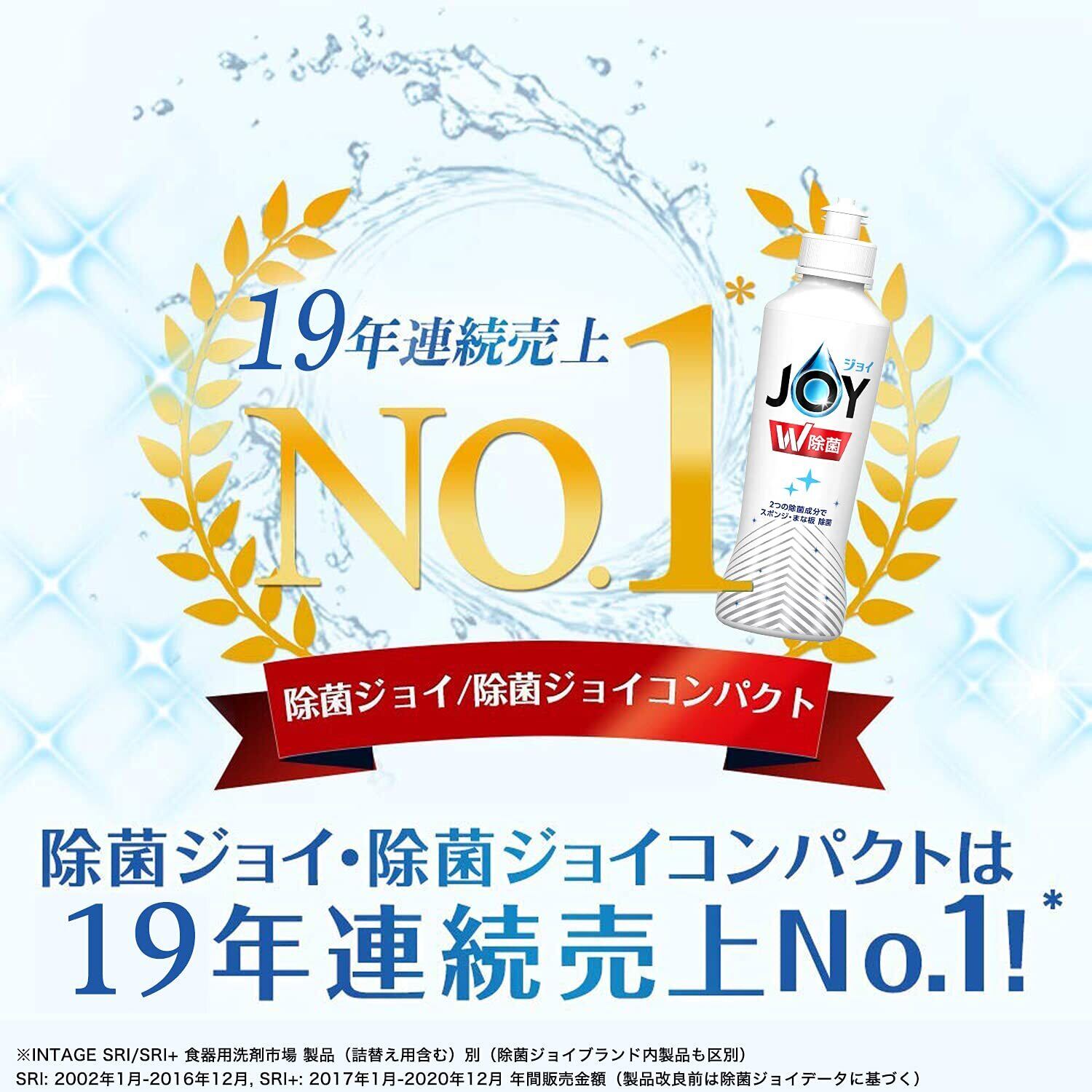 除菌ジョイ・除菌ジョイコンパクトは18年連続売上No.1※ ※INTAGE SRI 食器用洗剤市場 製品(詰替え用含む)別(除菌ジョイブランド内製品も区別)2002年1月-2019年12月(製品改良前は除菌ジョイデータに基づく)年間販売金額