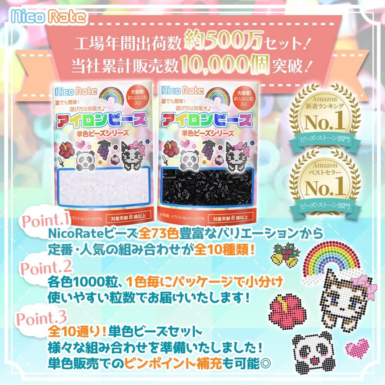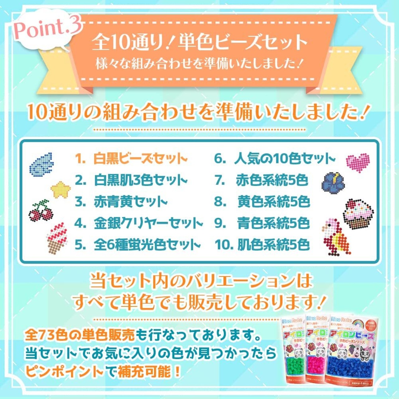 【商品紹介】アイロンビーズ専門ブランド「NicoRate」が企画いたしました、補充にとっても便利な単色ビーズセットです。全10通りの組み合わせで必要なビーズをまとめて購入できます!