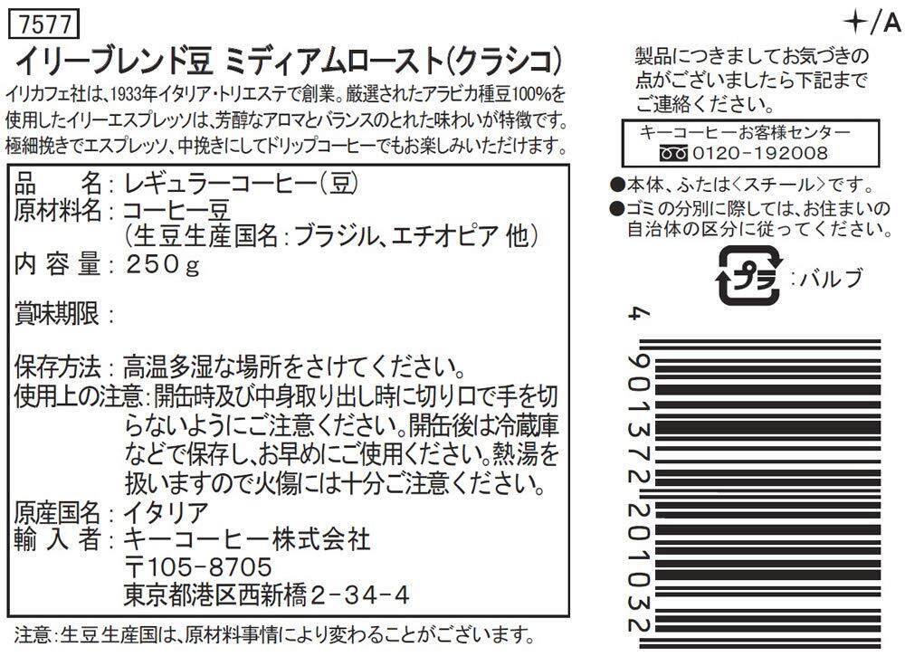 イリー ブレンド 豆 ミディアムロースト (クラシコ) 250g レギュラー(豆)