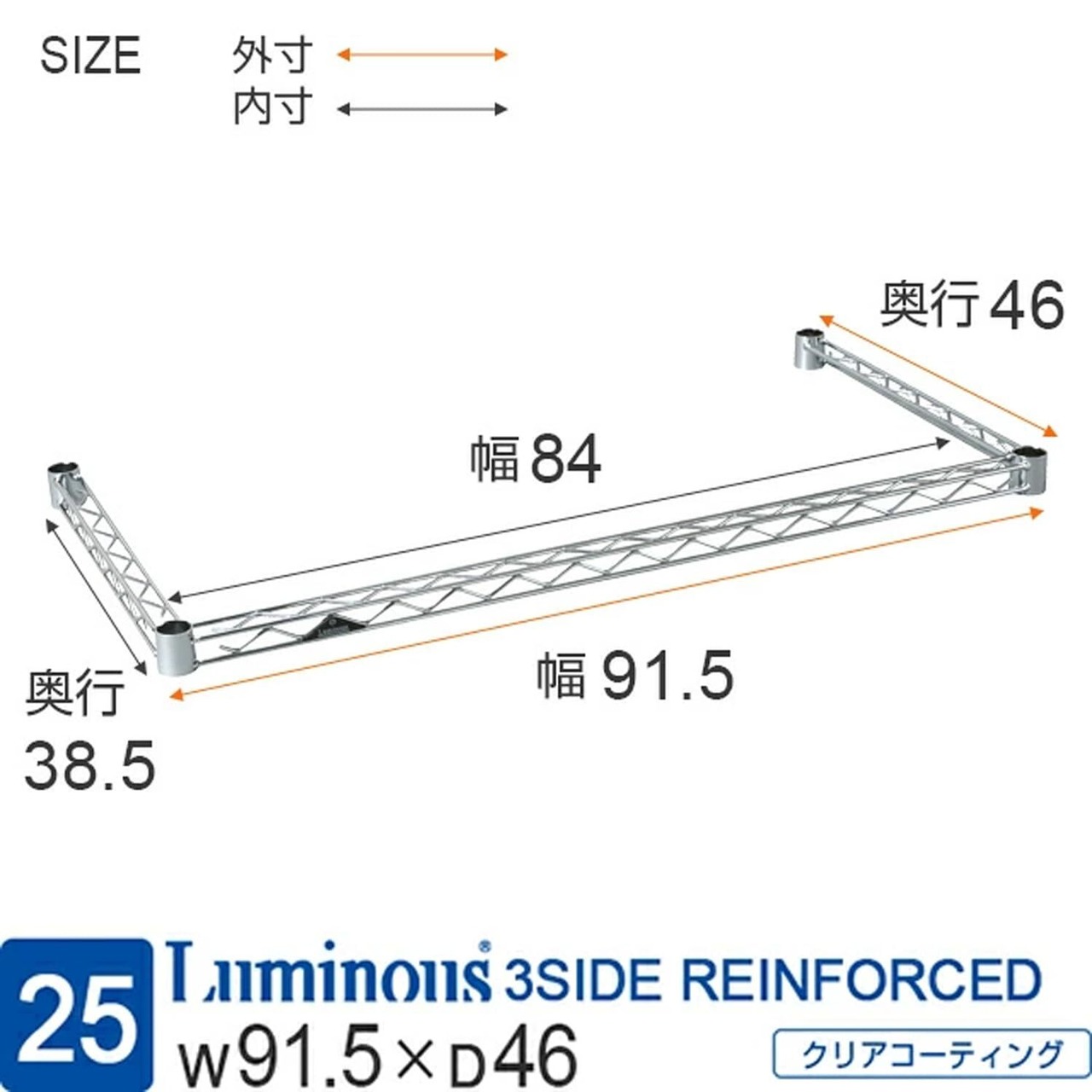 ドウシシャ ルミナス スチールラック 補強パーツ コの字バー ワイヤーバー 幅91.5×奥行46cm 25KWB9045 ポール径25mm スリーブ無し 落下防止柵 引掛け収納 頑丈 グラつき防止 ゴミ箱上 幅90モデル