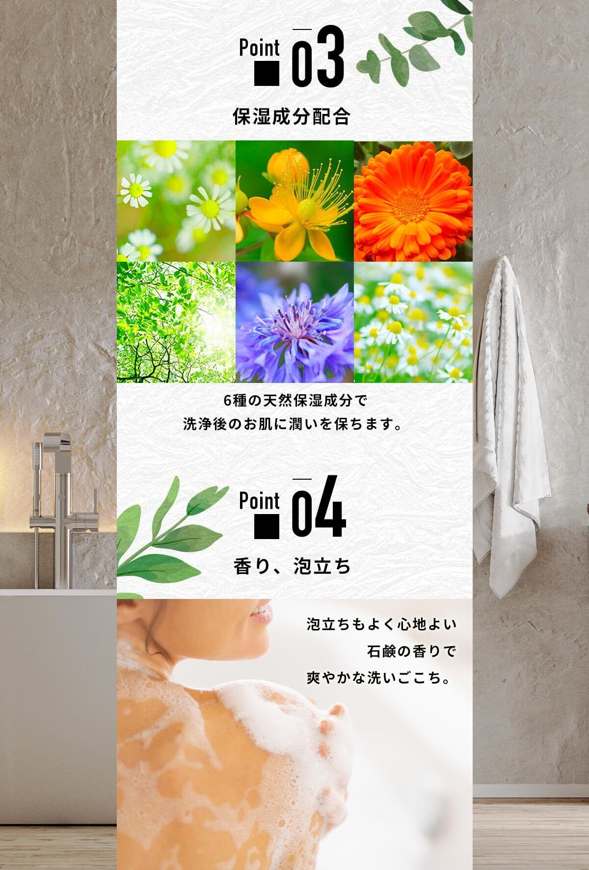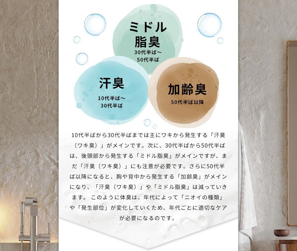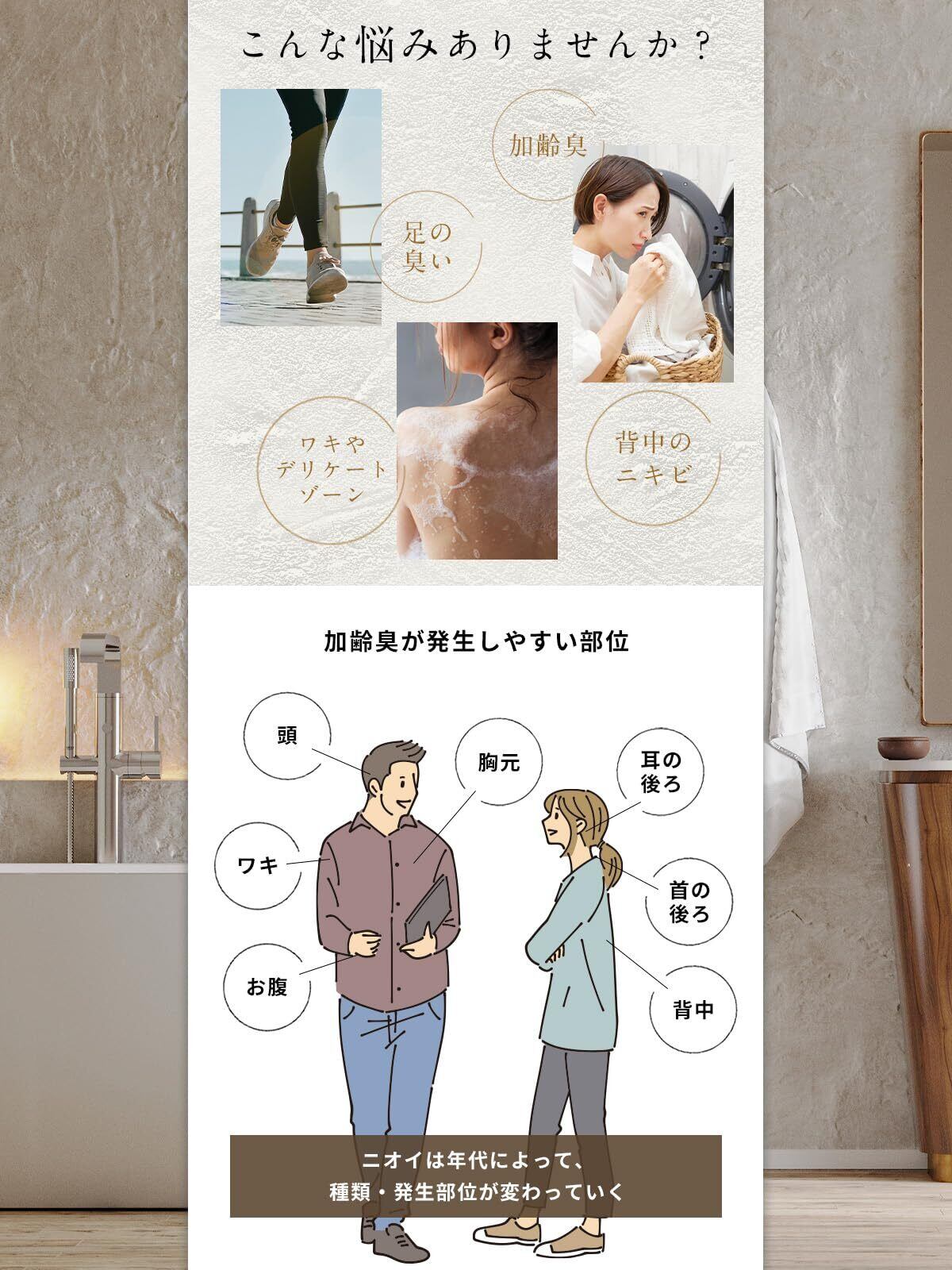 加齢臭が気になる、最近、背中のニキビが増えてきた、足の臭い、脇臭いが気になる、そんなお悩みに寄り添ったボディソープです。