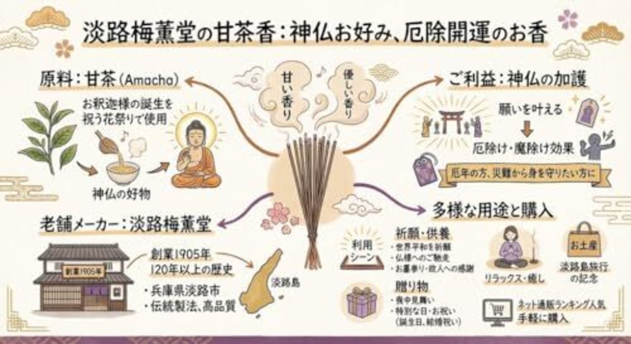 淡路梅薫堂の浄化お香(2026年厄年 厄除け 厄払い) お線香 神仏お好み 仏様のご馳走 魔除け 厄除開運あまちゃ香 90g 部屋用 仏壇用お線香 お茶の香り やさしい 甘茶香 (1箱) #097