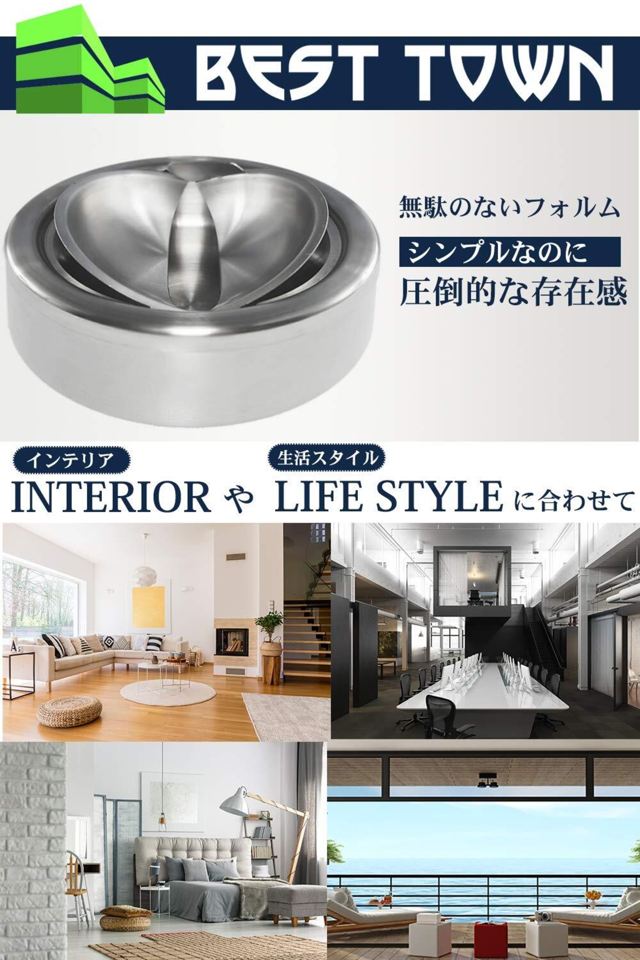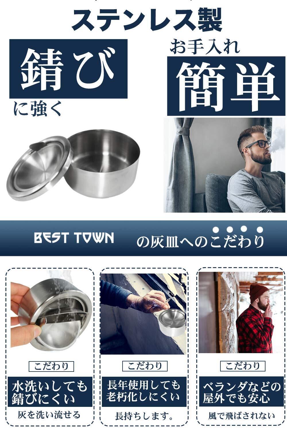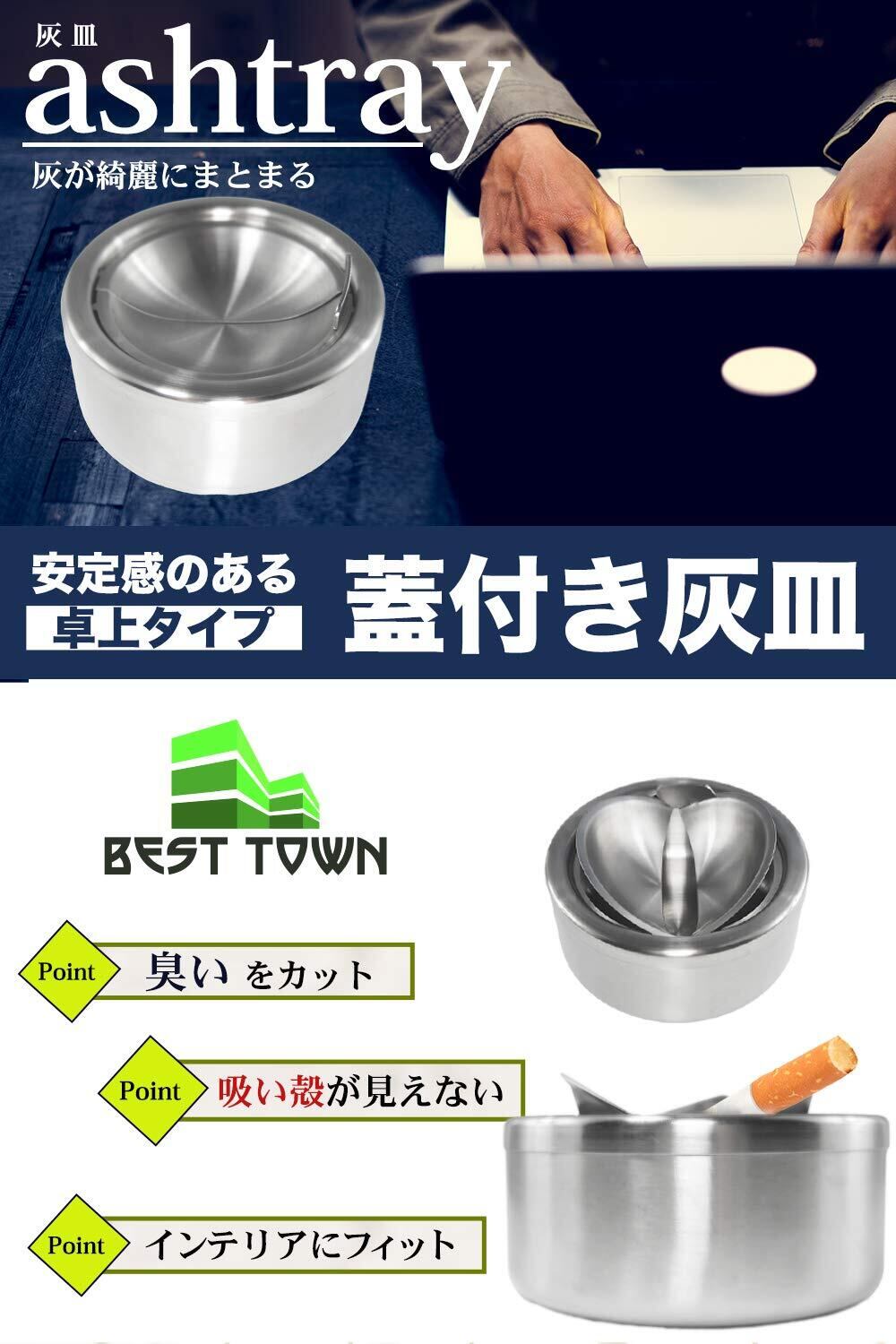 「BEST TOWN」製の蓋付き灰皿は、押すと観音開き式のフタが開閉する仕組みになっており、吸い殻が飛び散ることなく下に収まり臭いも煙も閉じ込めることが可能なかっこいいデザインとなっております。喫煙者本人は気にならなくても、家族など周囲の人が煙やにおいを気にする方も多いです。蓋付きの灰皿の方が回りへの拝領にもなりおすすめのポイントです。また、灰の飛び散りや吸い殻が見えてしまうことも防ぐことが可能です。外観はシンプルモダンな仕様でお部屋の中に置いてもインテリアのアクセントにもなります。