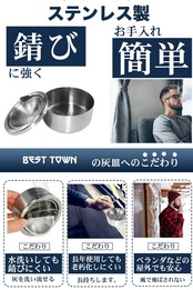 本商品は、ステンレス製となっております。ステンレスは、錆に強く水洗いをしても大丈夫なので、お手入れが簡単です。長年使用しても老朽化しにくいこともメリットの一つです。タバコを吸う頻度が高い方や灰皿を持ち運びしたい方におすすめの灰皿です。室内はもちろん室外でも使用可能の灰皿です。強い風でも飛ばされにくいため、ベランダなどの屋外でも安心してご利用いただけます。また、蓋を外すことも可能なので、水洗いの時は非常にらくです