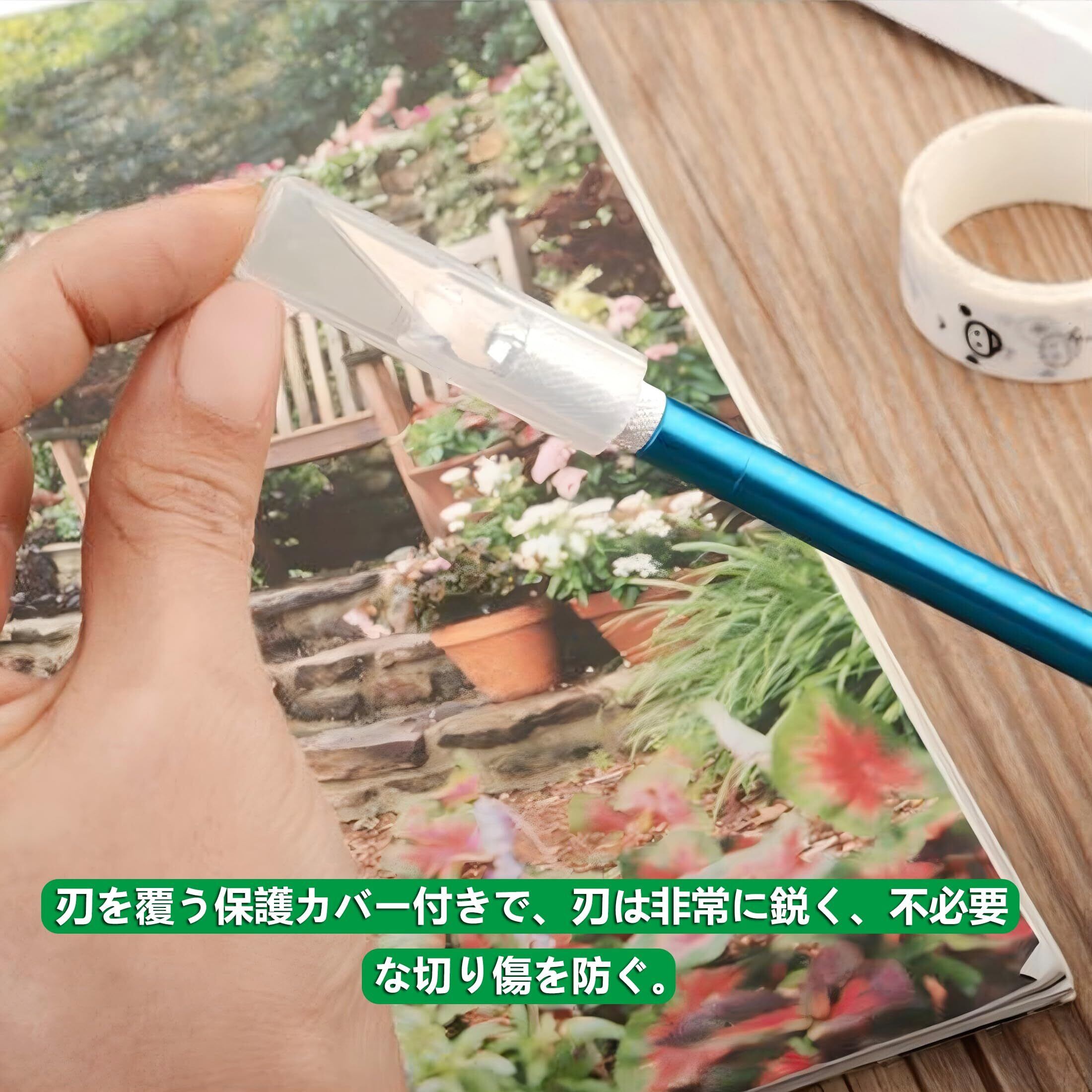 【セット内容】デザインナイフ本体、替え刃5枚、替え刃ケース、保護キャップ