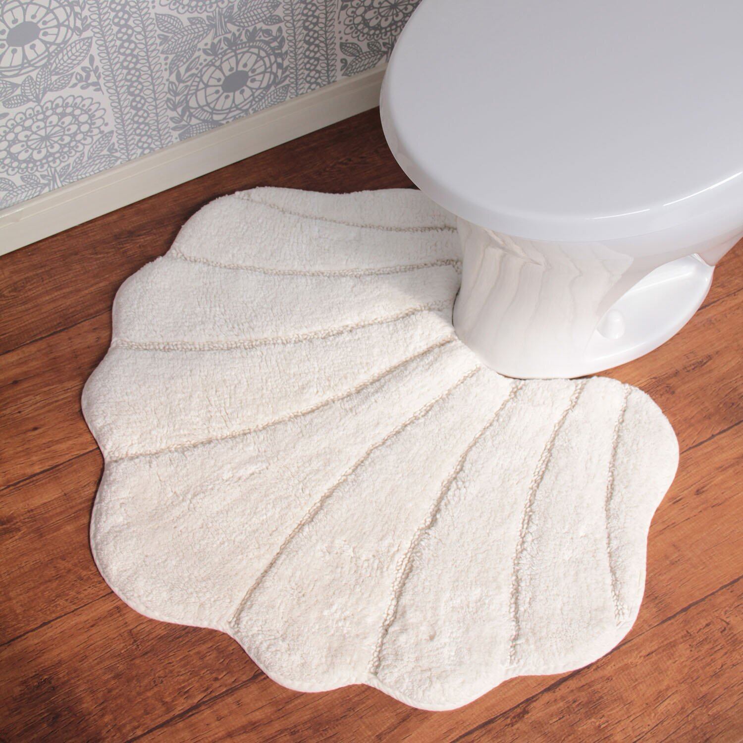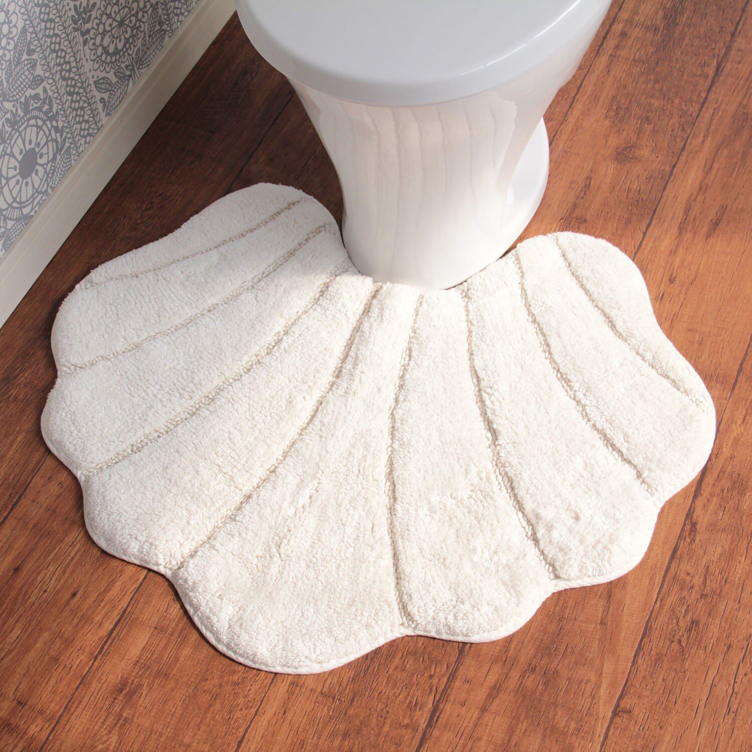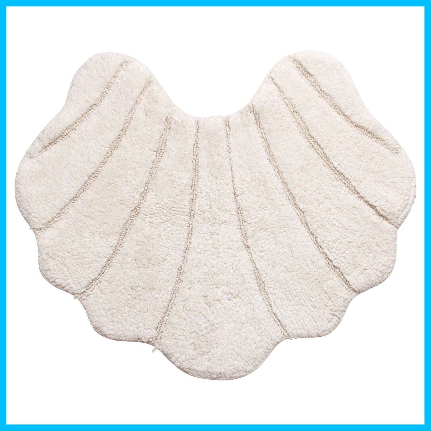 コットン素材のシェル型のトイレマット。綿の出荷量世界2位のインド綿を使用しています。シェル型のトイレマットは、トイレを上品に演出します。綿素材なので吸水性もよく、汚れても気軽に洗えます。マットには滑り止め加工付きで、滑らず安心です。