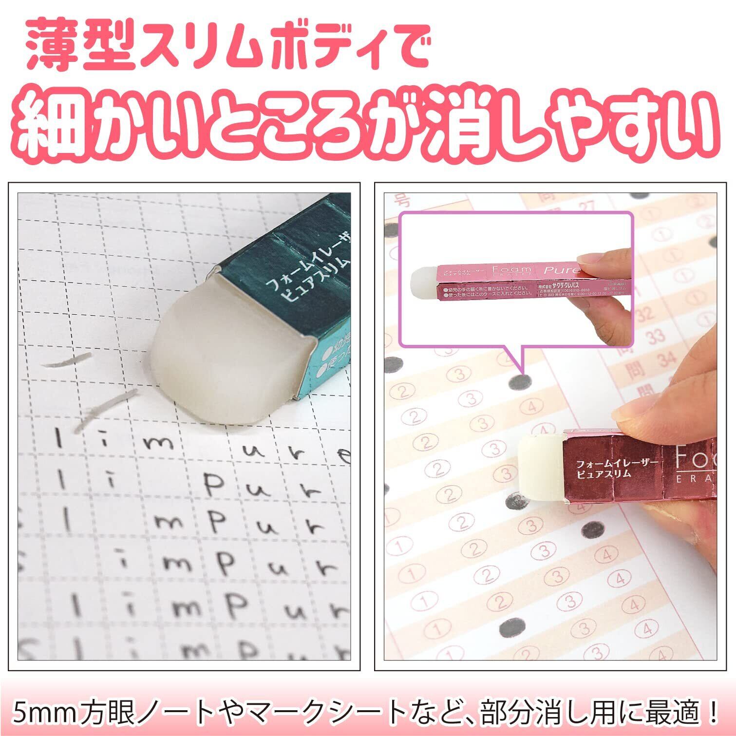 【特長1】ペンケースに入れてもかさばらないスリムタイプで、細かいところも軽く消せる