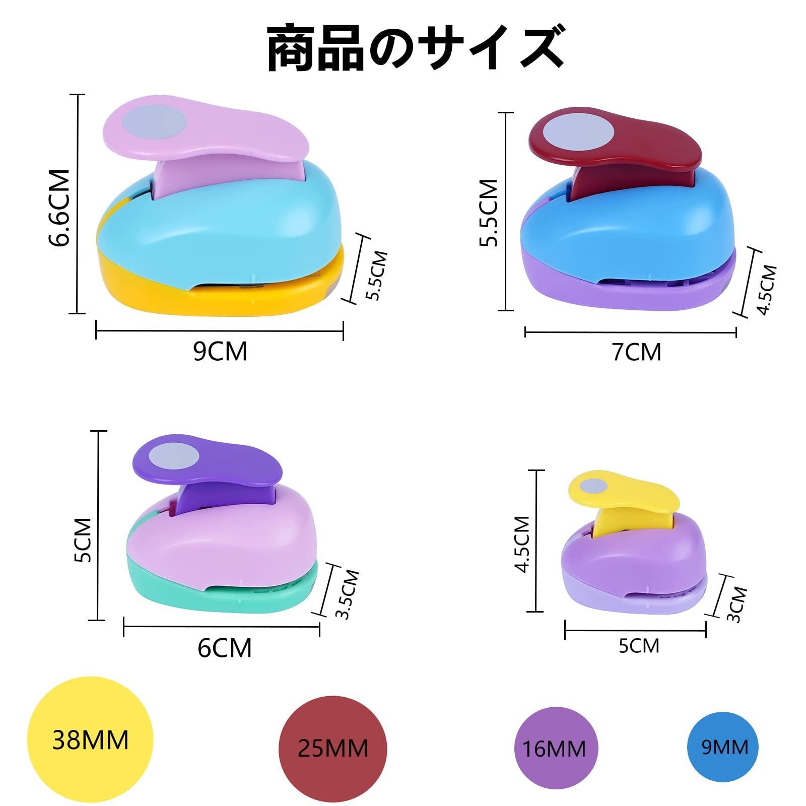 【クラフトパンチ 4枚セット サイズ】:9*6.6*5.5cm、7*5.5*4.5cm、6*5*3.5cm、5*4.5*3cm、扁平:3.8-0.9cm 。【クラフトパンチ色】:混合色。適正用紙厚:コピー用紙2枚程度、または四六判120kg程度。