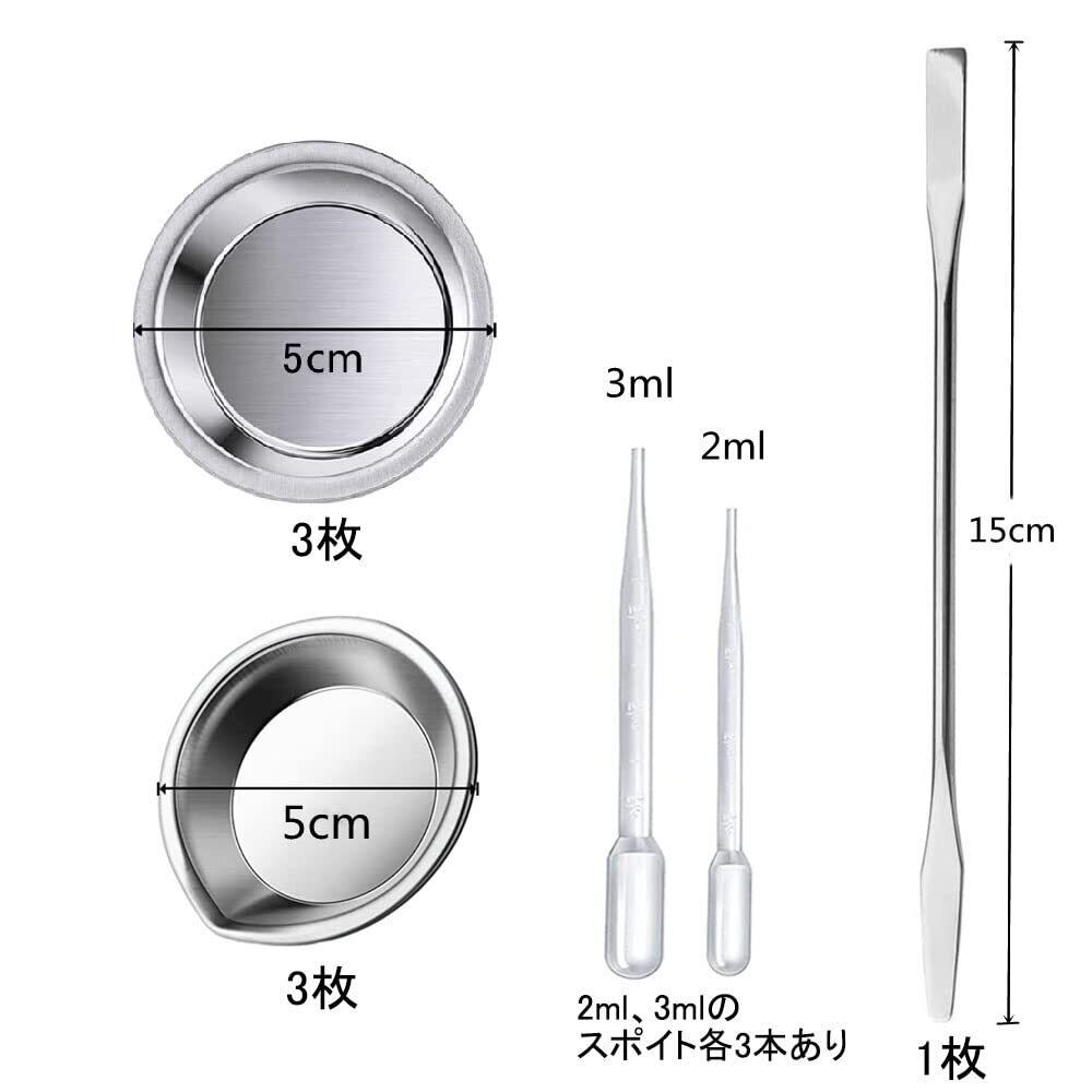 スポイト:2ml、3mlのスポイト各3本あり,塗料皿に塗料に移すなどの場合に役に立ちます。付属のスポイトは、自分の好きな色合いを微調整するのに便利な道具です,さまざまな割合を作成でき。