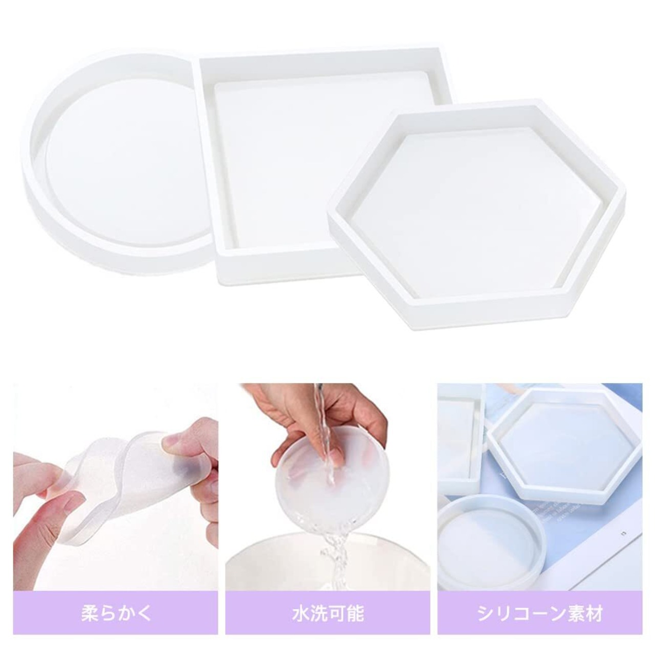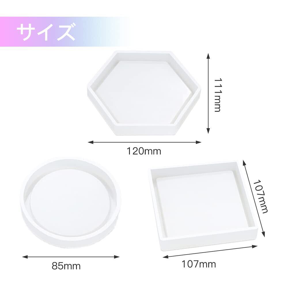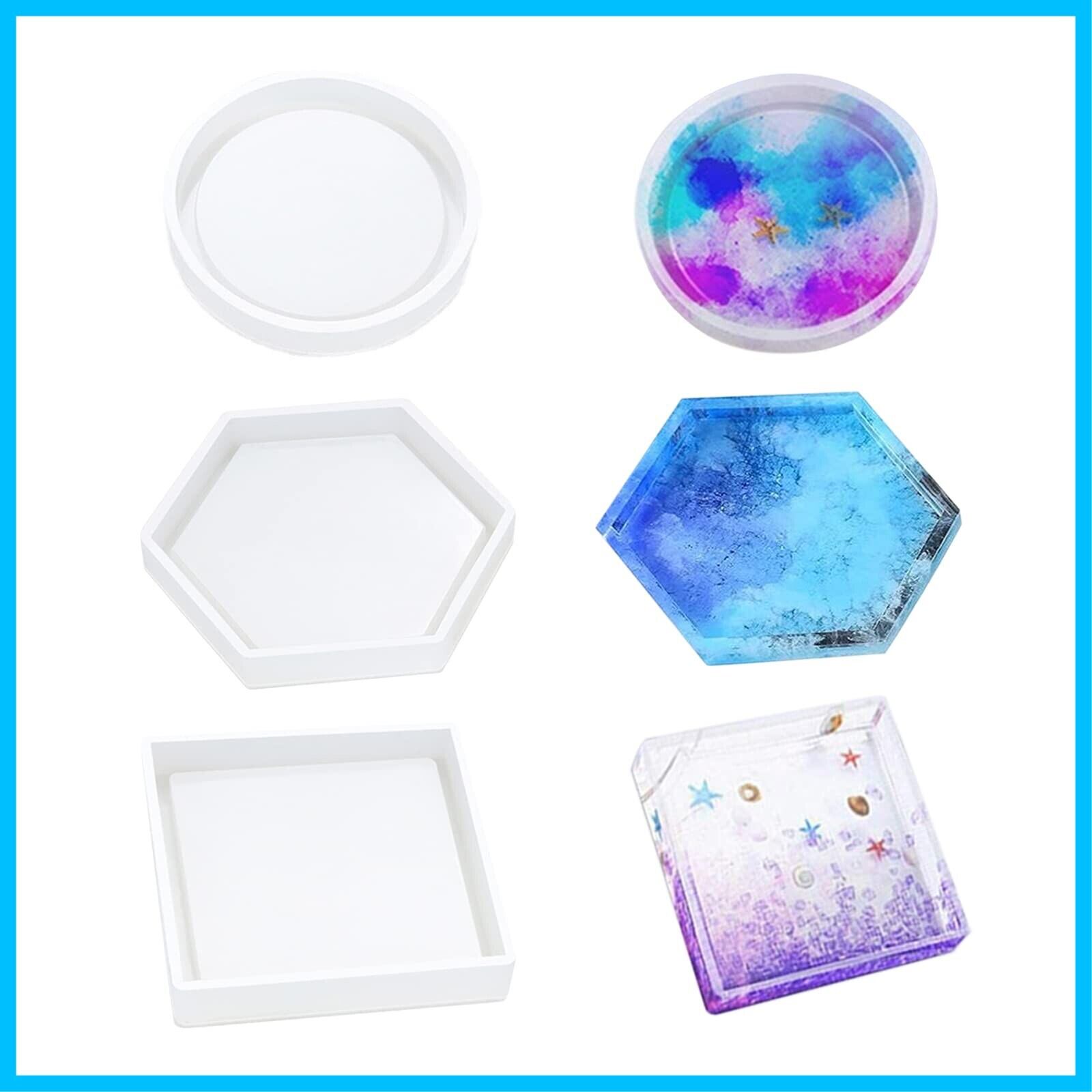 サムコス 3個セット コースター シリコンモールド 丸 六角形 正方形 エポキシ樹脂 UVレジン 粘土 ソフトモールド DIY 手作り 置き皿 皿 型 抜き型 取り出し簡単 樹脂工芸品 贈り物 (F)