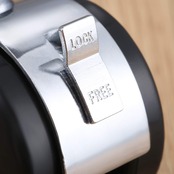 ストッパー機能ありの本製品はロックボタンがあります。LOCKに押せば、キャスターを固定できます、FREEに押せば360°旋回や自在移動ができます。