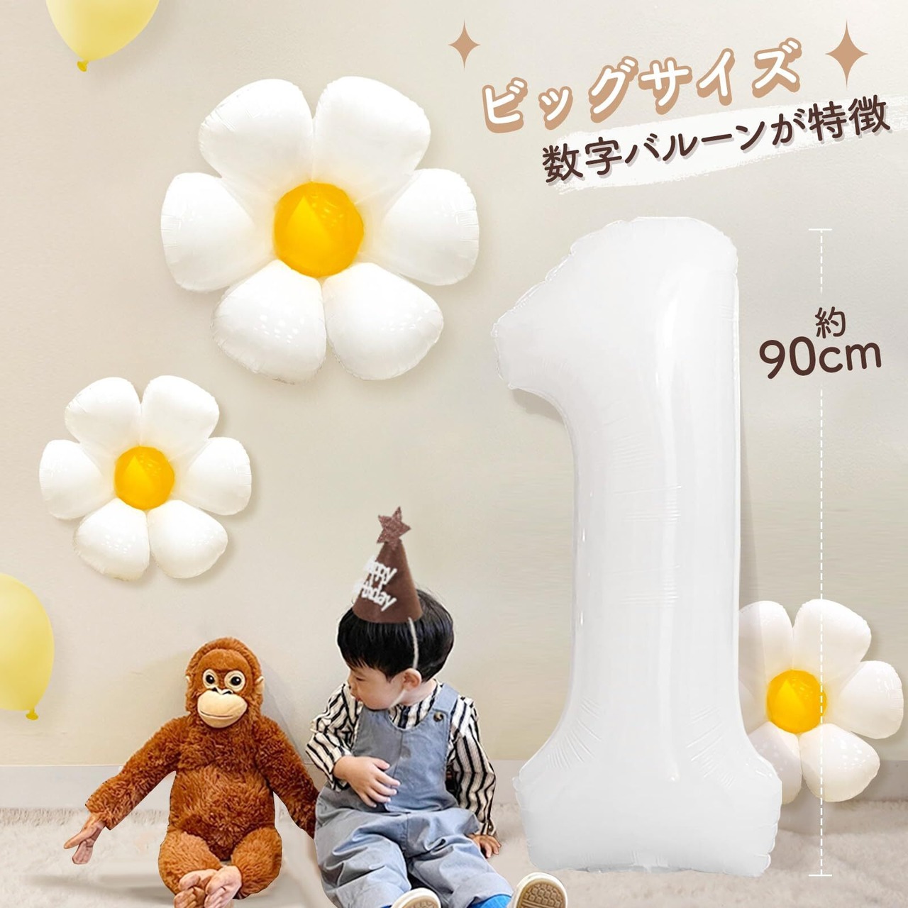 【特別なファーストバースデイ】お誕生日の飾り付けにインパクト大!HAPPY BIRTHDAY文字バルーン&ナンバーバルーン&デイジーバルーンなど複数のアイテムと組み合わせて、誕生日ムードを盛り上げてくれるバルーンセット!誕生日は1年に1度の特別な日、記念撮影用のスペースを部屋の一角に作っておきましょう。