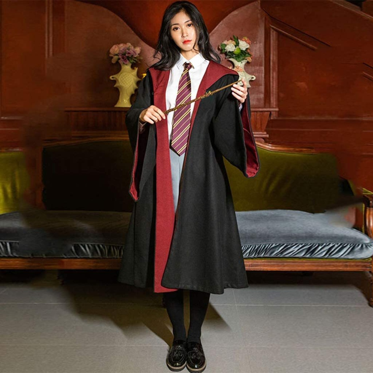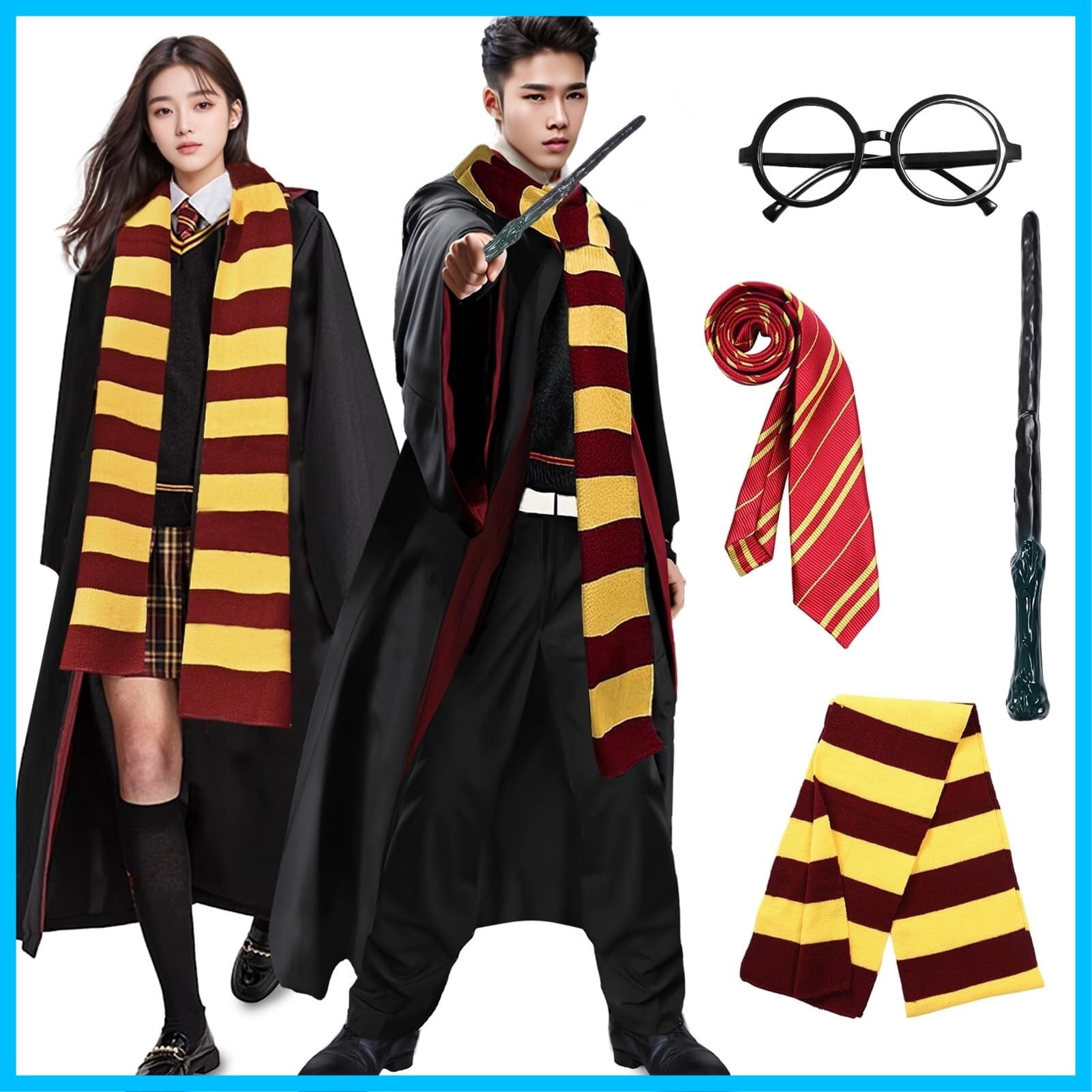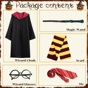 【セット内容】:ローブ、眼鏡、ネクタイ、スカーフ、魔法の杖の5点セットです、すべての装備が揃っています、原作を忠実に再現されたデザインになっております。