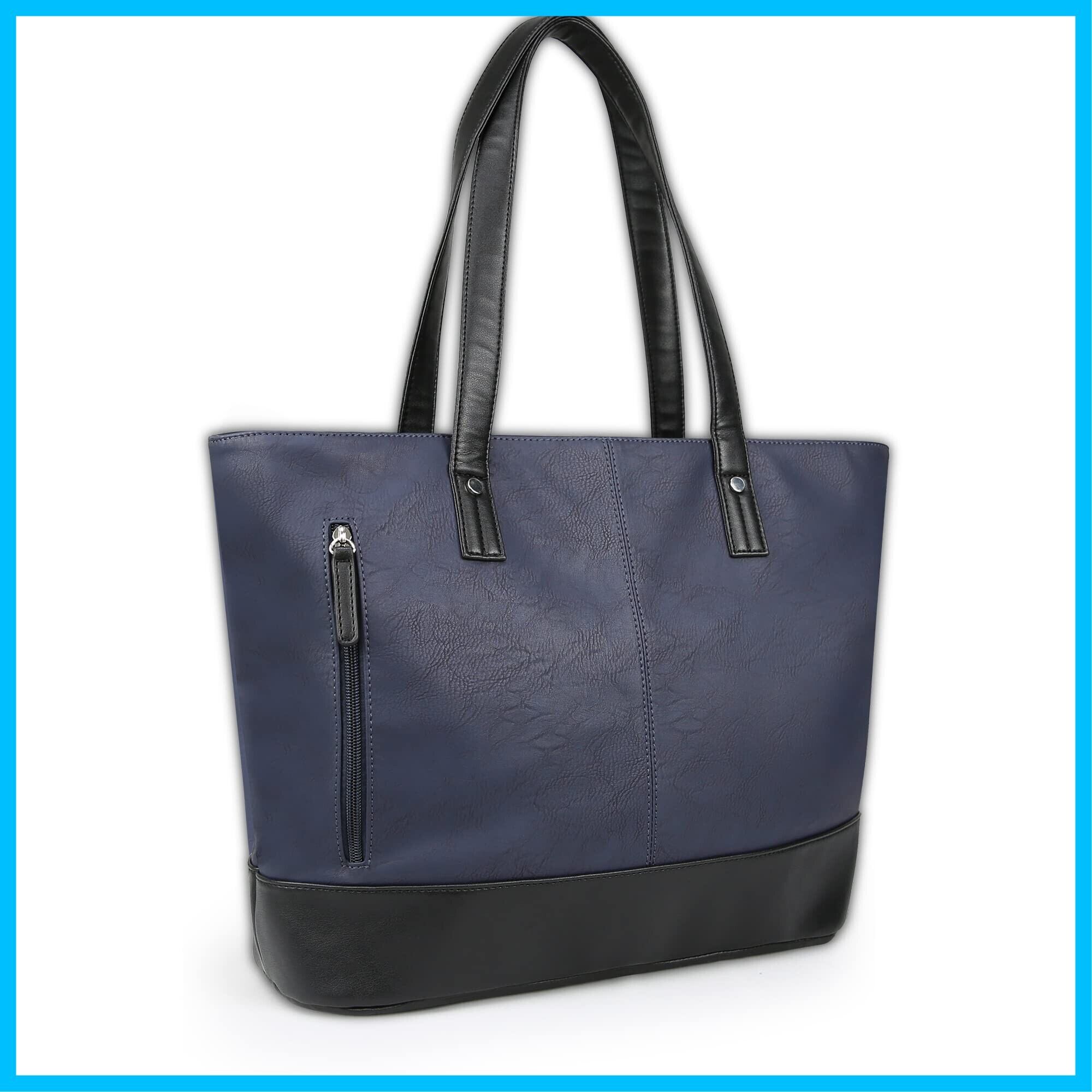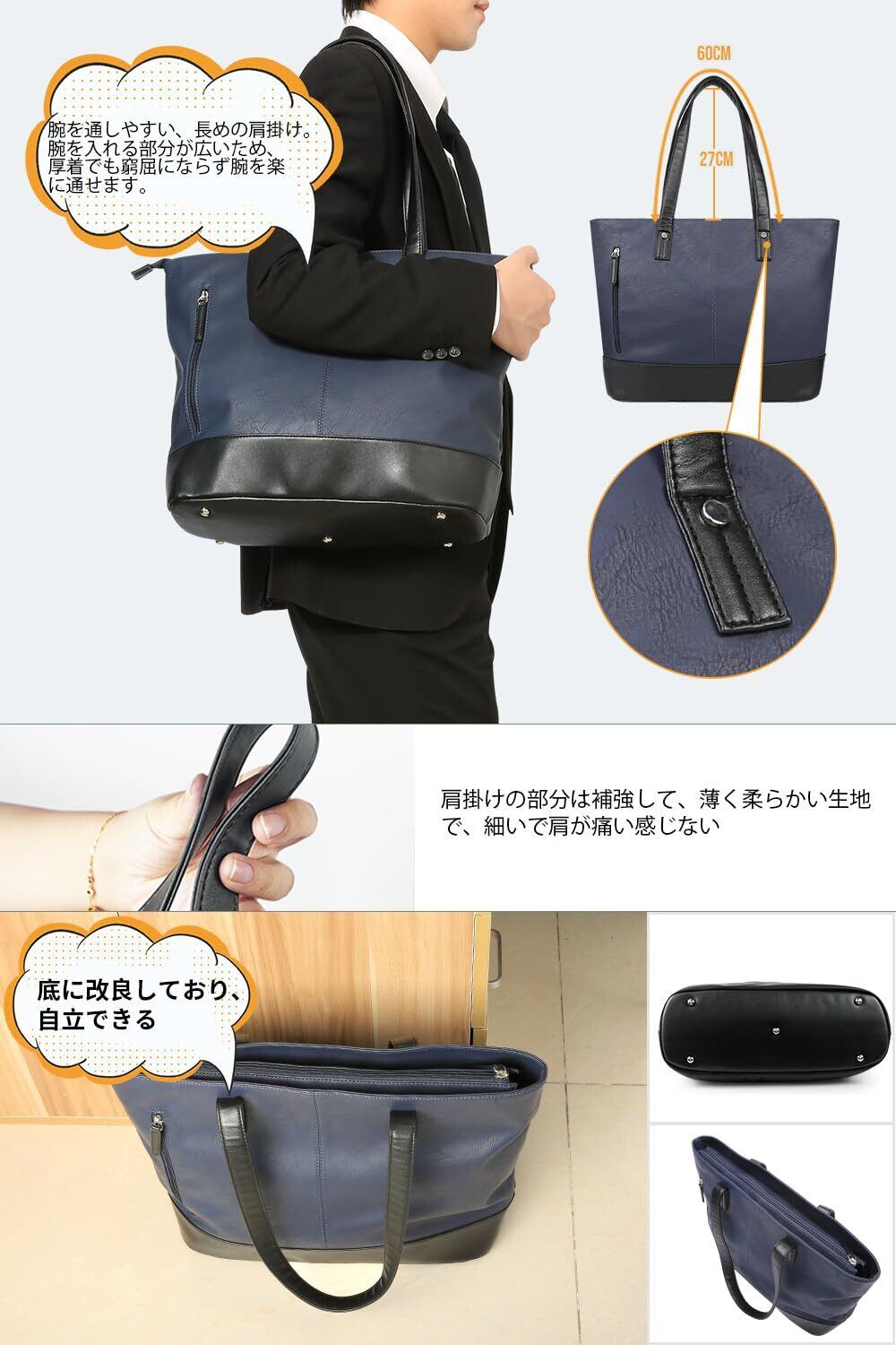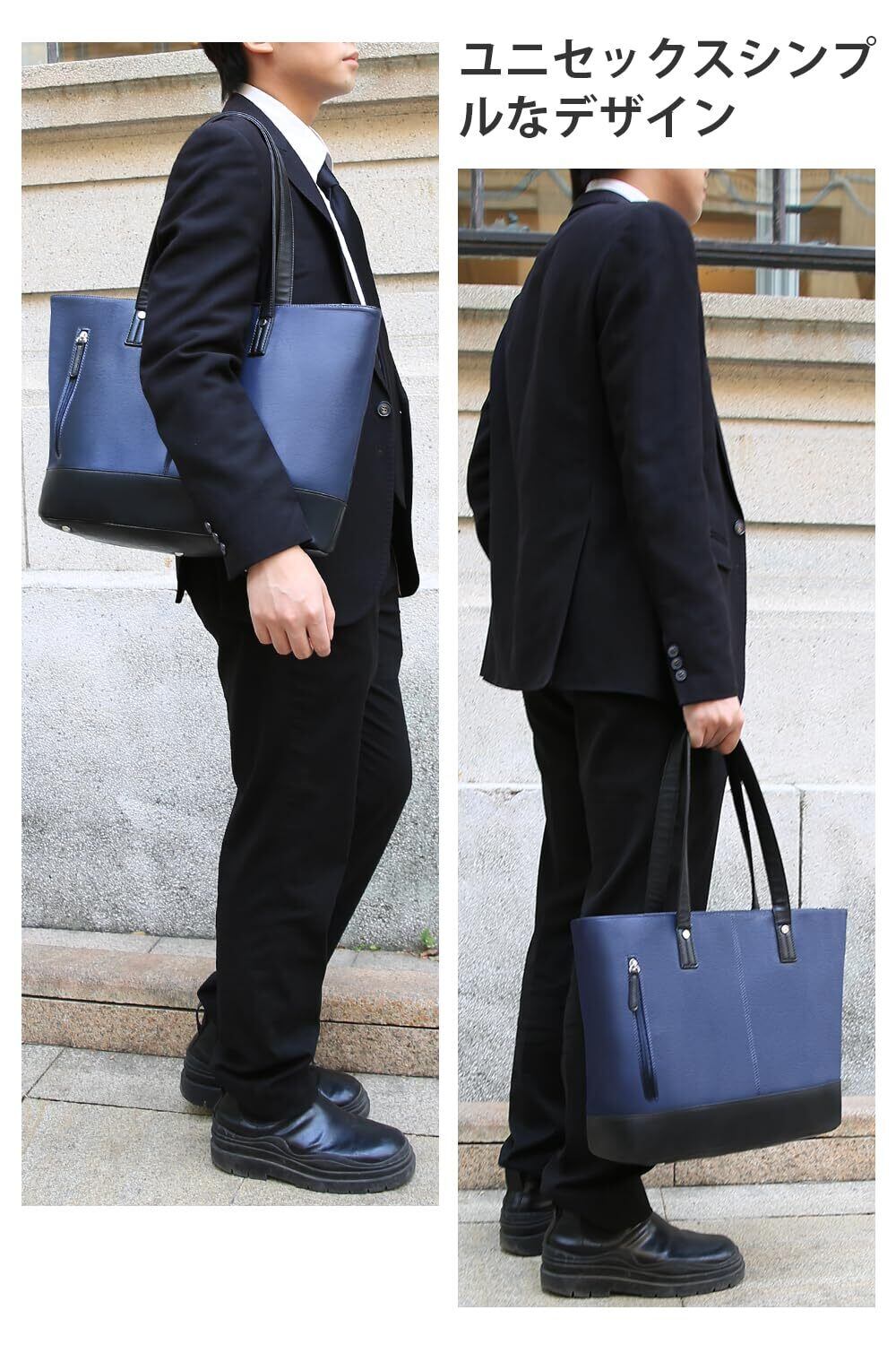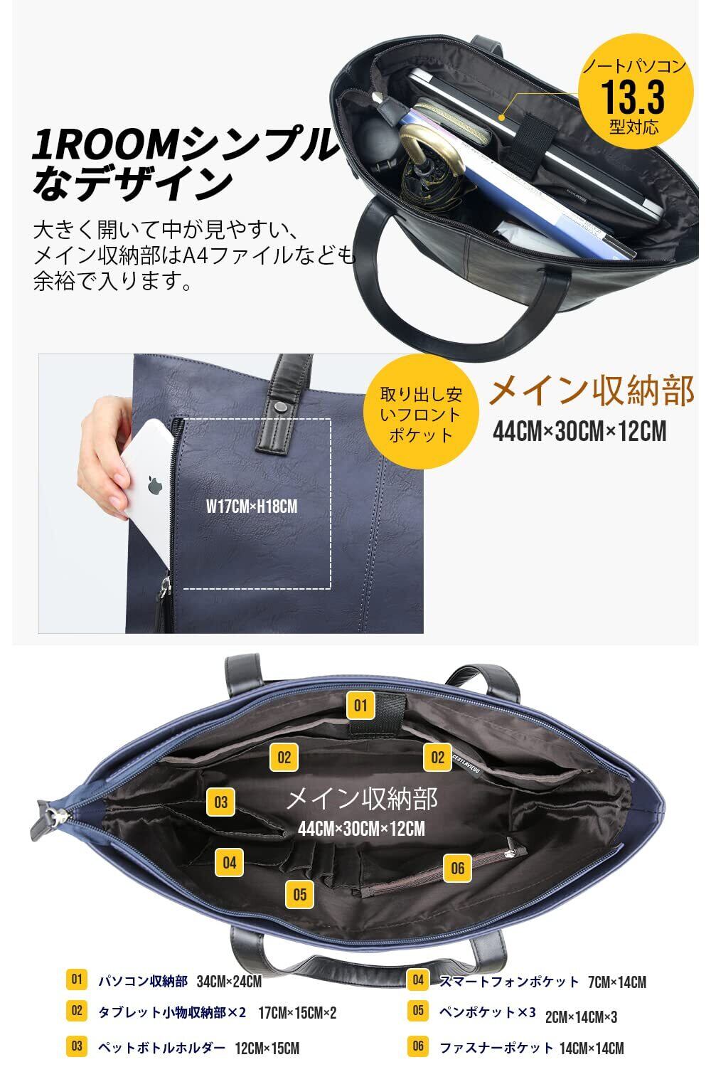トートバッグ ビジネスバッグ メンズ レディース 大容量 防水 自立 大きめ PUレザー A4 13.3型PC収納 ビジネストートバッグ メンズ ファスナー付き 就活 通勤 通学 出張 旅行 (ネイビー) 45*30*12.5cm
