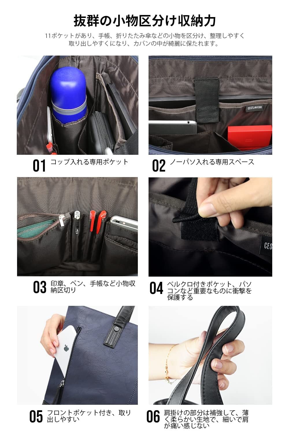 【優れた収納力と機能性】ビジネストートバッグのメイン収納部に大きなファスナーポケットがあり、A4雑誌や13.3型までノートパソコンを余裕で収納可能です。また、小分けポケットが数多く内臓され、財布、ボールペン、折りたたみ傘などの小物の整理整頓や出し入れしやすく、カバンの中が綺麗に保たれます。更にスマホ、ハンカチをサッと取り出せるフロントポケットも付いております。