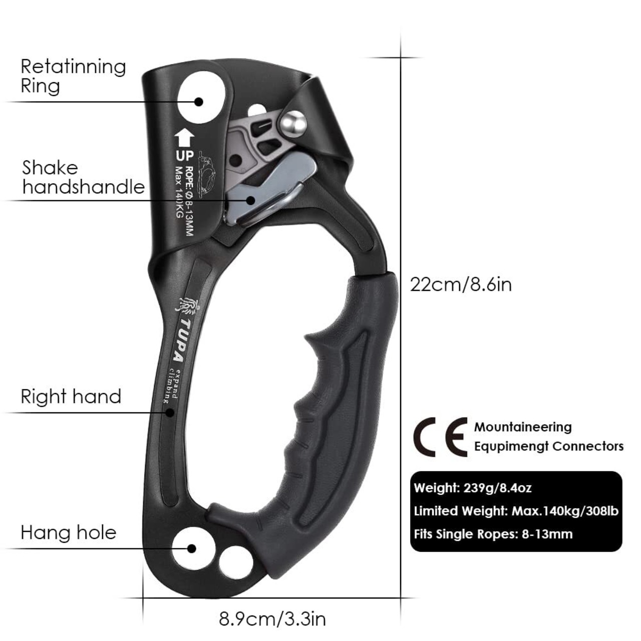 【サイズ】シングルロープに適しています:8-12mm、サイズ:22*8.6cm、重量239g、左側に適しています。