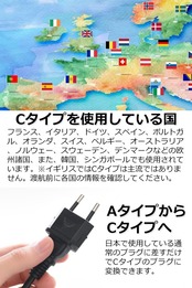 【 Cタイプを使用している国 】 フランス、イタリア、ドイツ、スペイン、ポルトガル、オランダ、スイス、ベルギー、オーストラリア、ノルウェー、スウェーデン、デンマークなどの欧州諸国、また、韓国、シンガポールでも使用されています。※イギリスではCタイプは主流ではありませんのでお調べの上ご購入下さいませ。