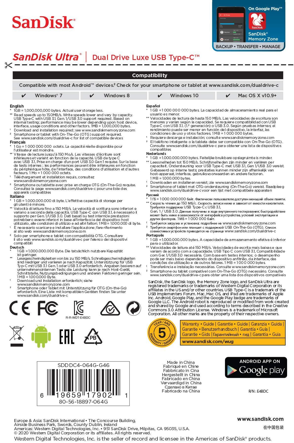 SanDisk 64GB Ultra Dual Drive Luxe USB Type-C (USB 3.1 Gen 1 / USB 3.0) Flash Drive International Packaging