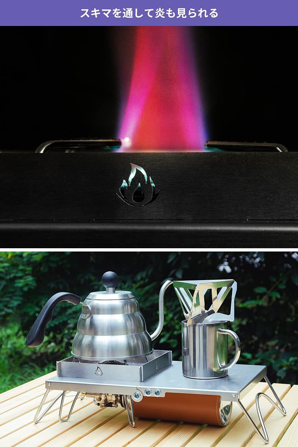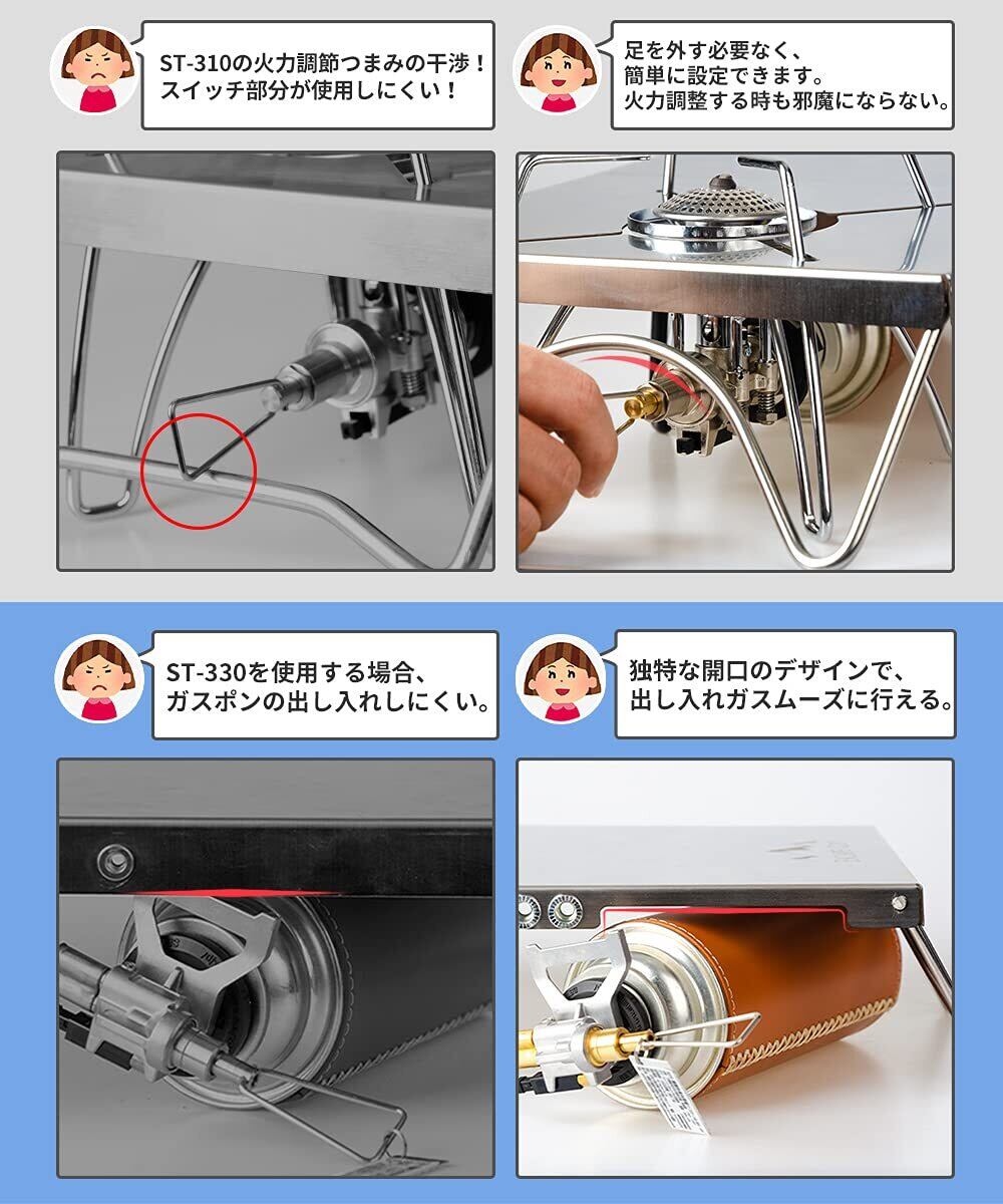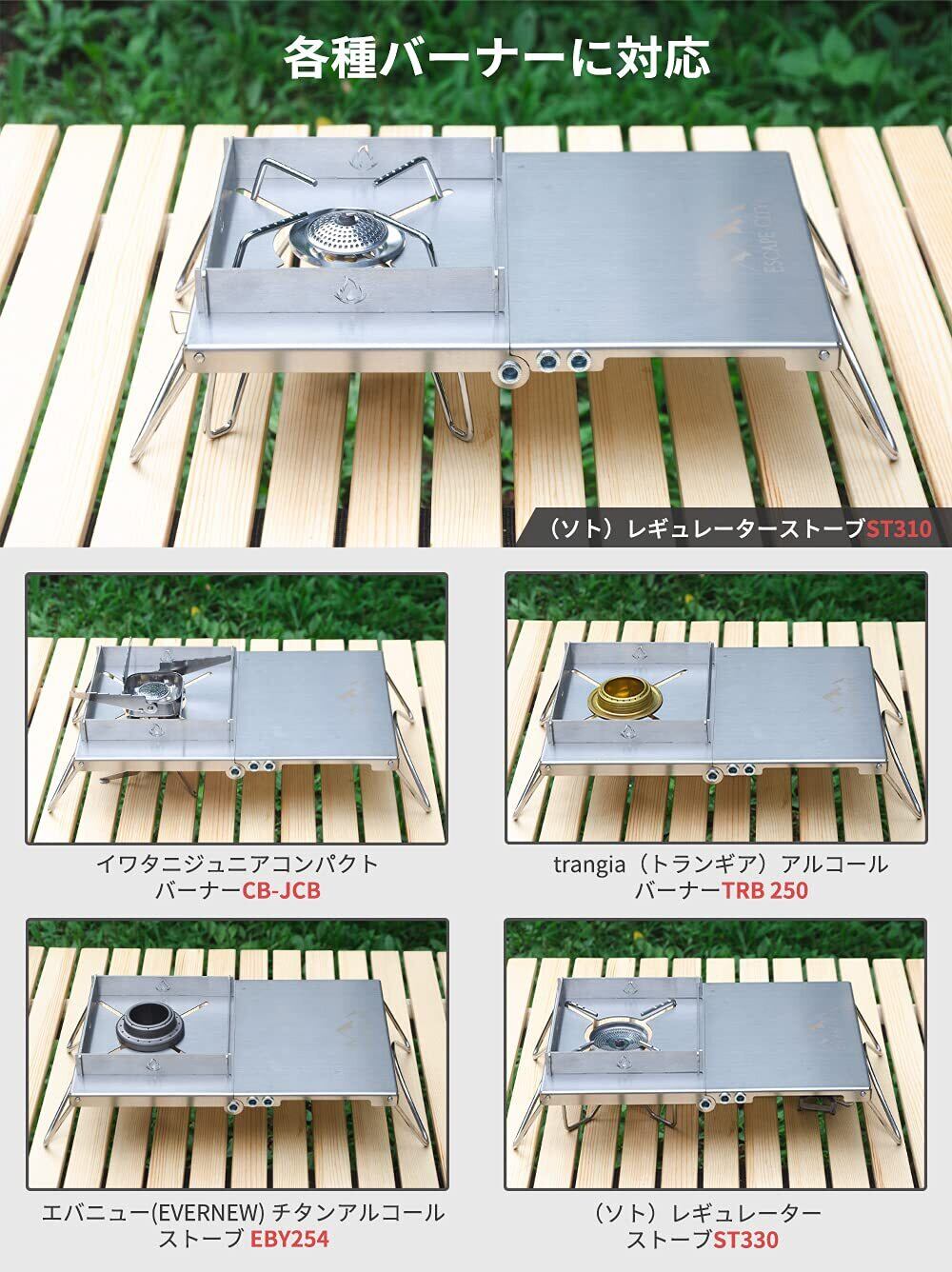 【五種類バーナー対応・安定性】キャンプの定番アイテムとしてのST-310、ST-330、イワタニジュニアコンパクトバーナー、trangia(トランギア) アルコールバーナー、エバニュー(EVERNEW) チタンアルコールストーブ EBY254及び同じ形のアルコールバーナーに対応します。足は1.6mm太さで曲面デザインを使うのでしっかりした安定性を持っています。
