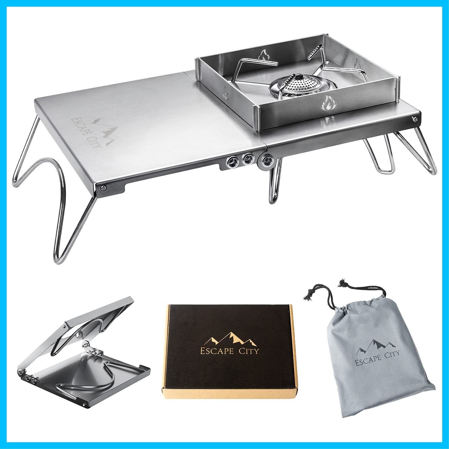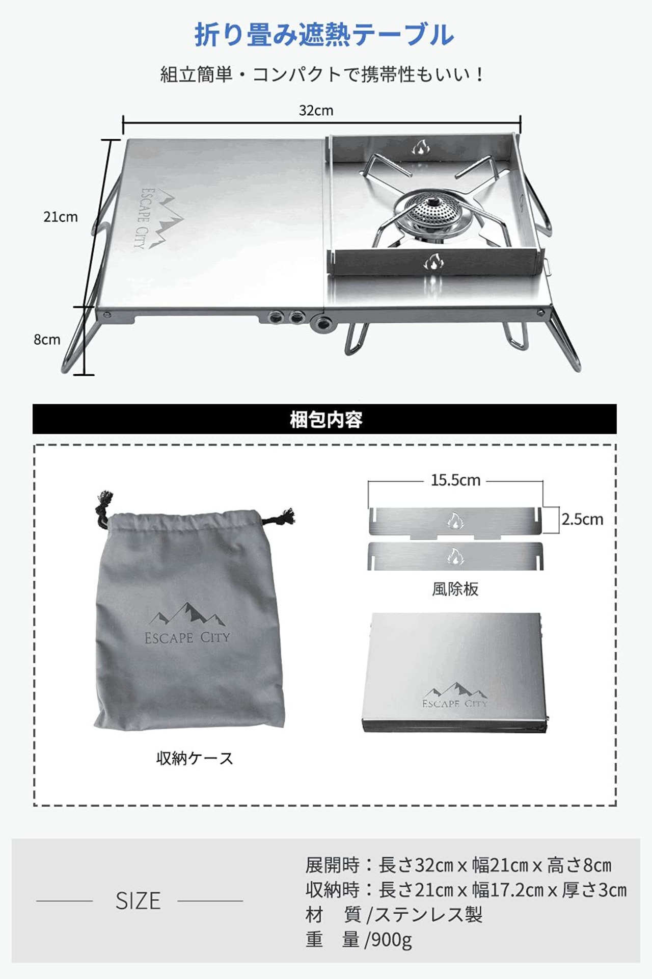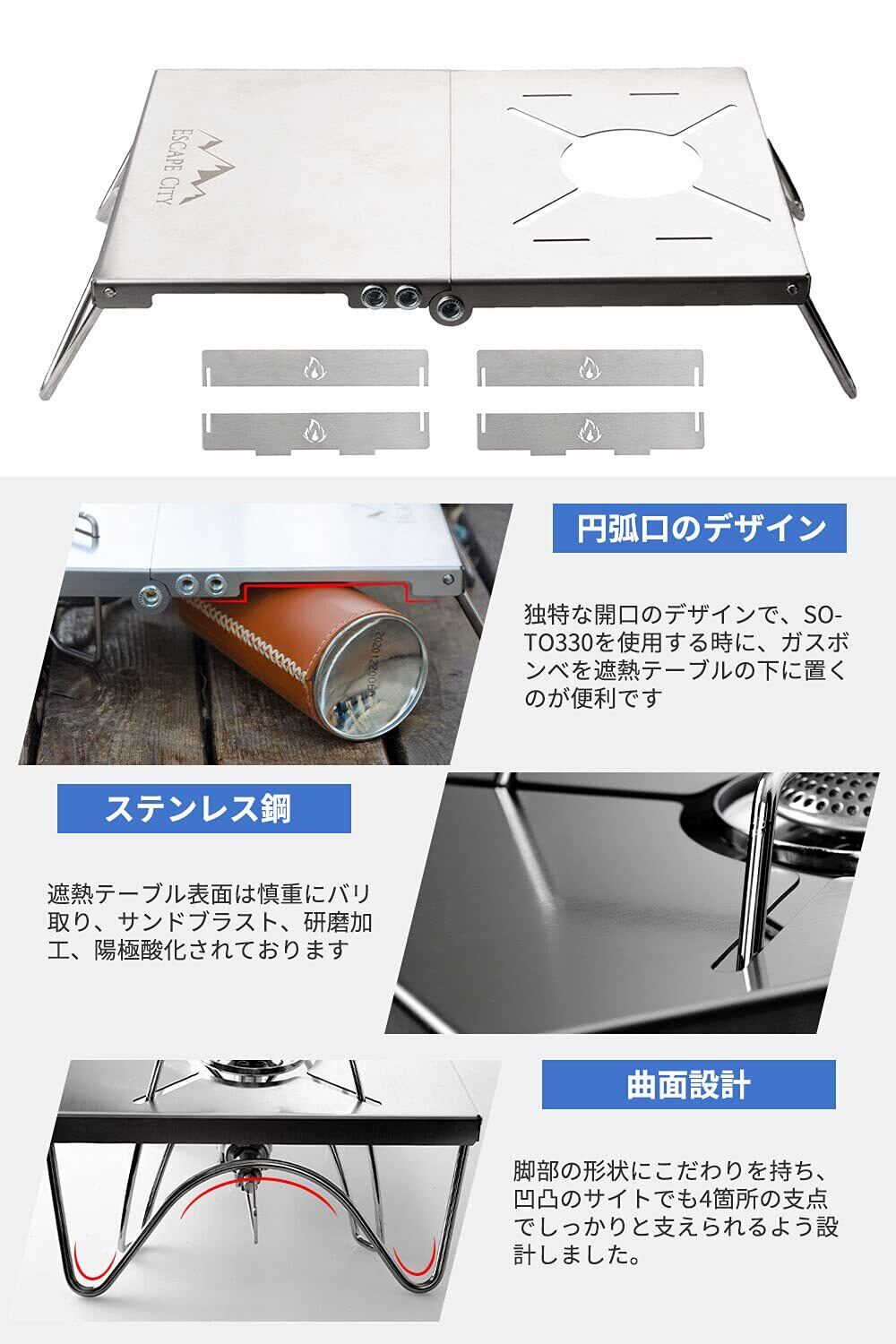 遮熱テーブル 遮熱板 シングルバーナー用 軽量 折り畳み ステンレス製 キャンプ用品 ソト SOTO ST-310/ ST-330 イワタニ トランギア 五種類バーナー対応 収納袋と風除板付き…