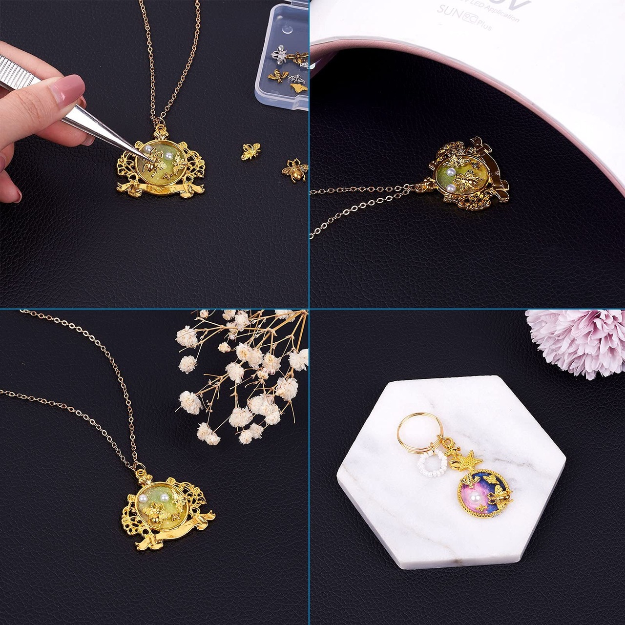 【レジンパーツ】:レジンフレームとレジン液を使用して、好きなレシピや作り方で初心者さんも簡単レジンクラフトを楽しむことができ、ユニークなペンダント、ヘアピン、キーホルダー、ストラップなど色々なアクセサリーを作ることができます。