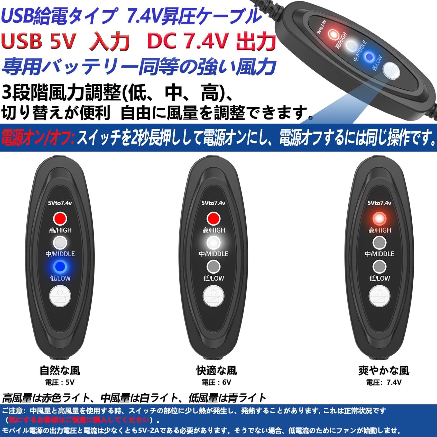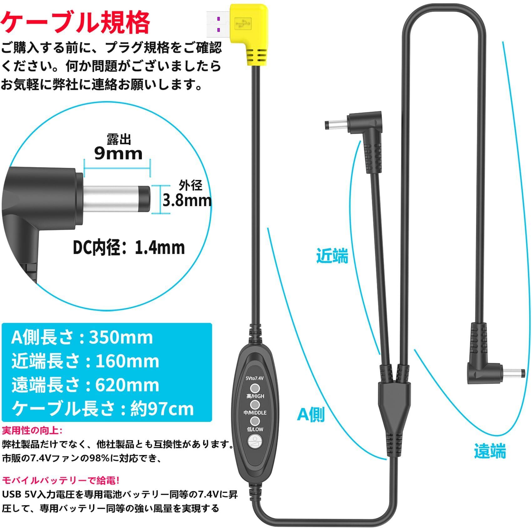 【商品紹介/ケーブル仕様】:USB電源昇圧変換ケーブル 5V→7.4V昇圧ケーブル 、昇圧変換ケーブルにより、モバイル電源USB 5Vの電圧を7.4Vに上げ、強風と同等の出力を実現します。 ファン側:オス DC内径:1.4mm 外径:3.8mm プラグ露出部分長さ:9mm 。