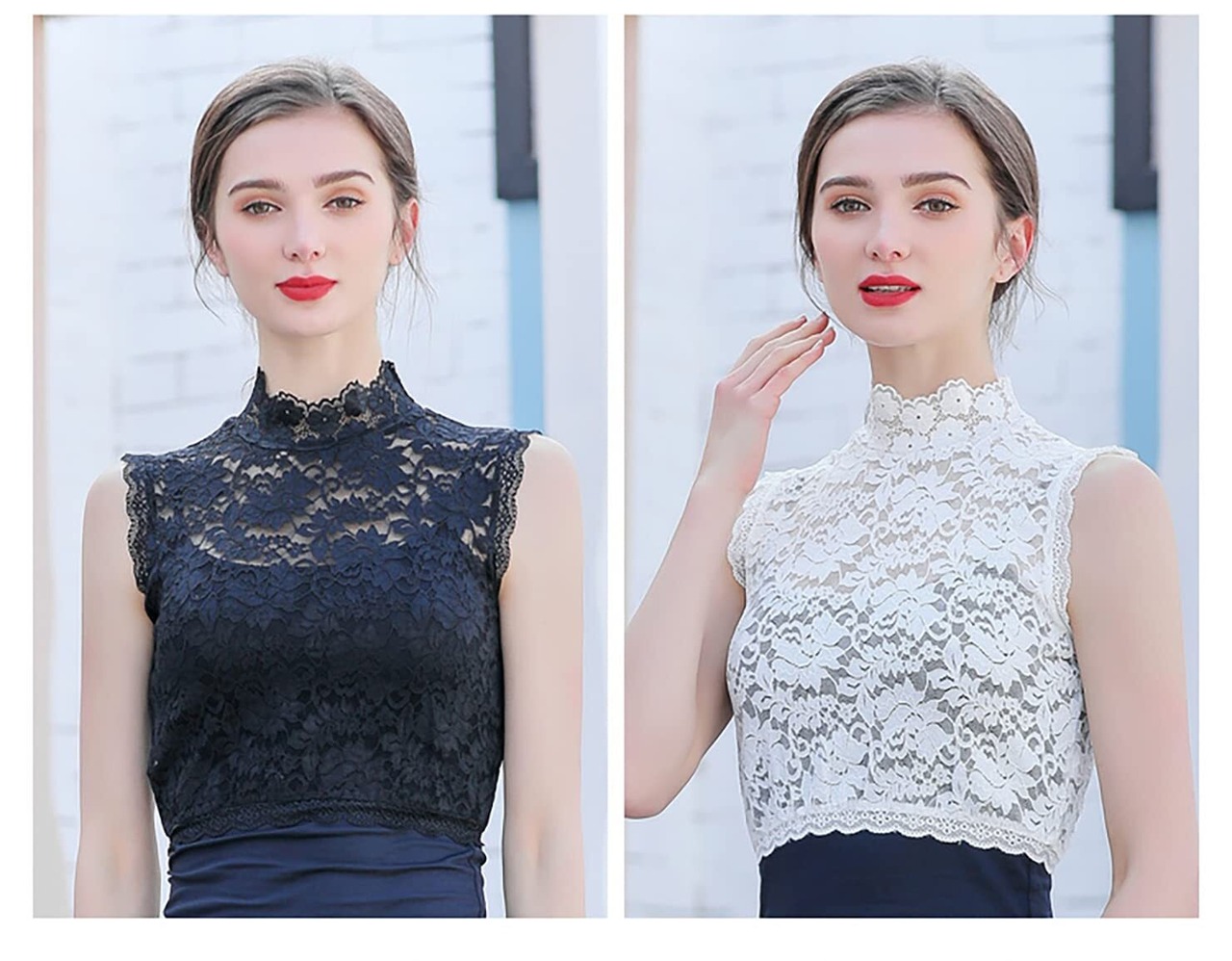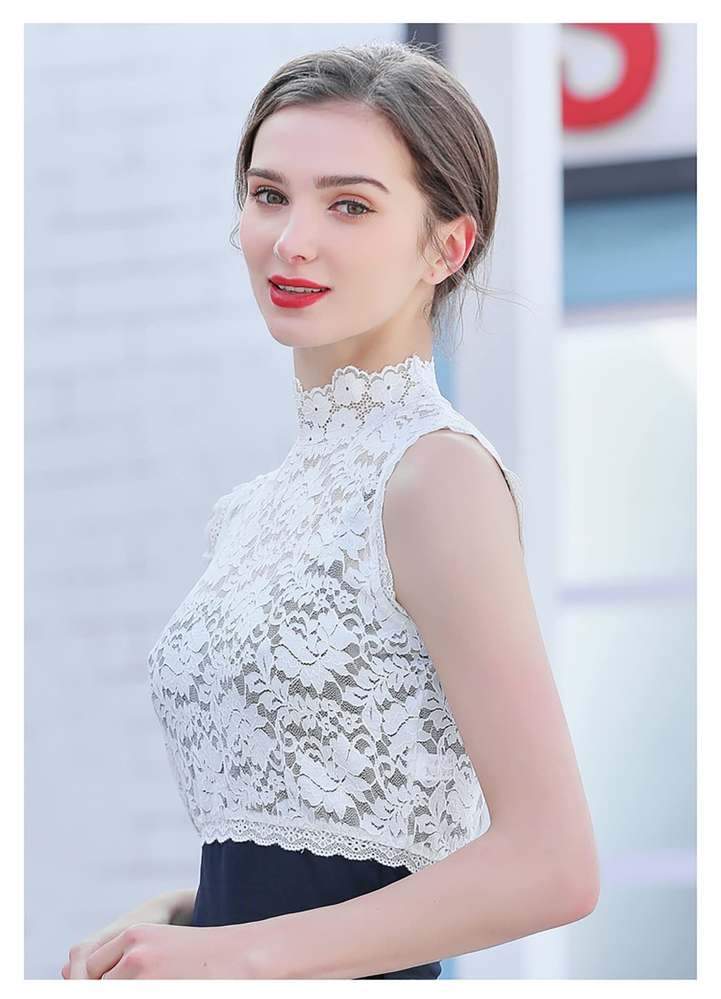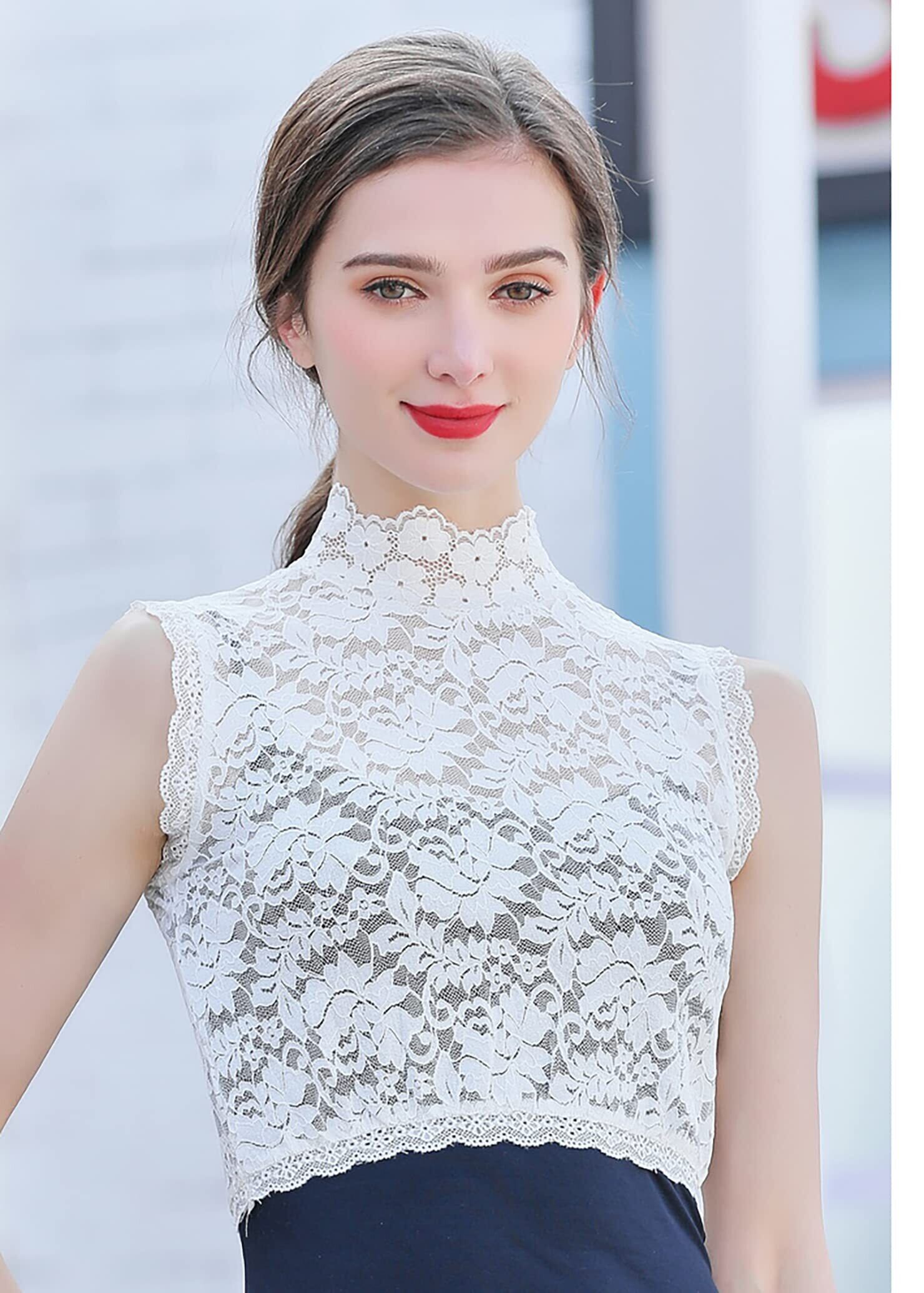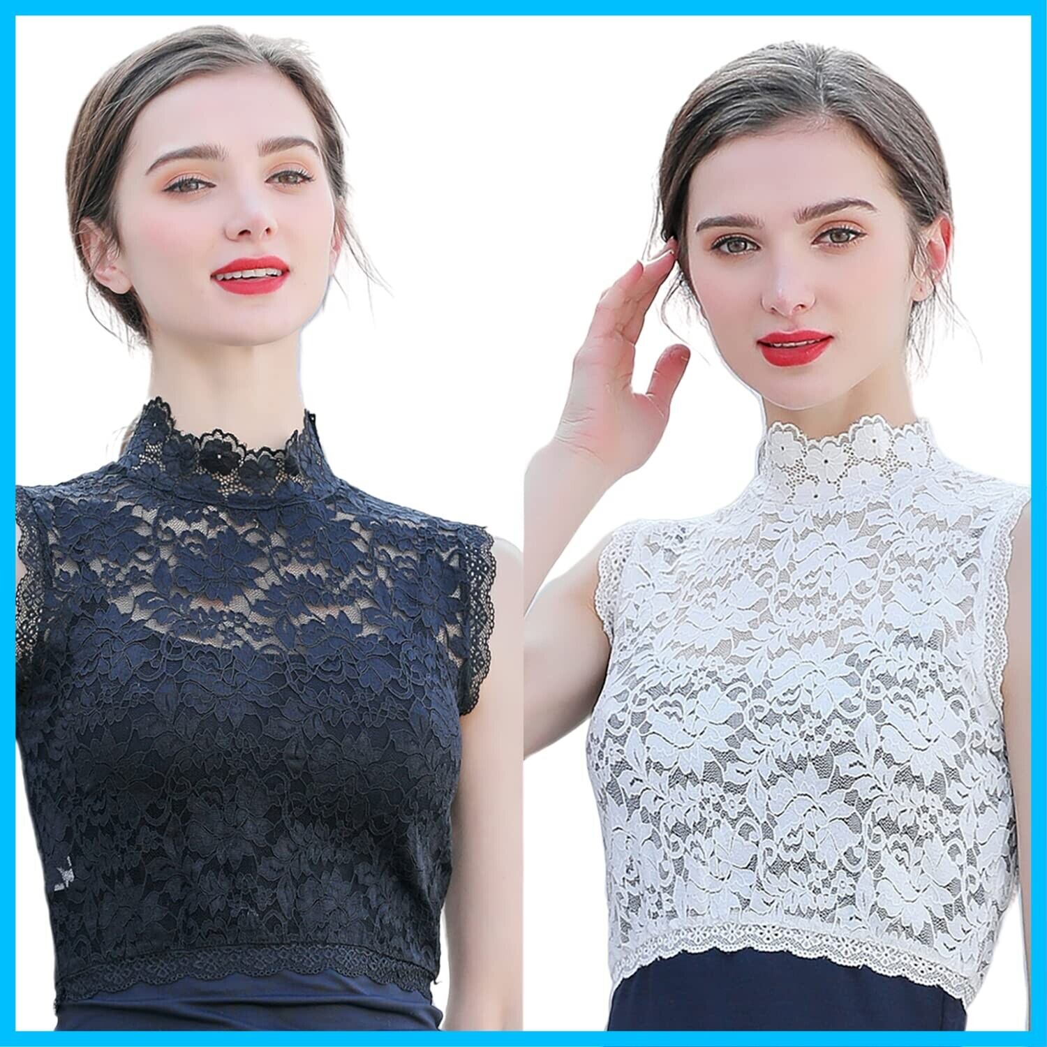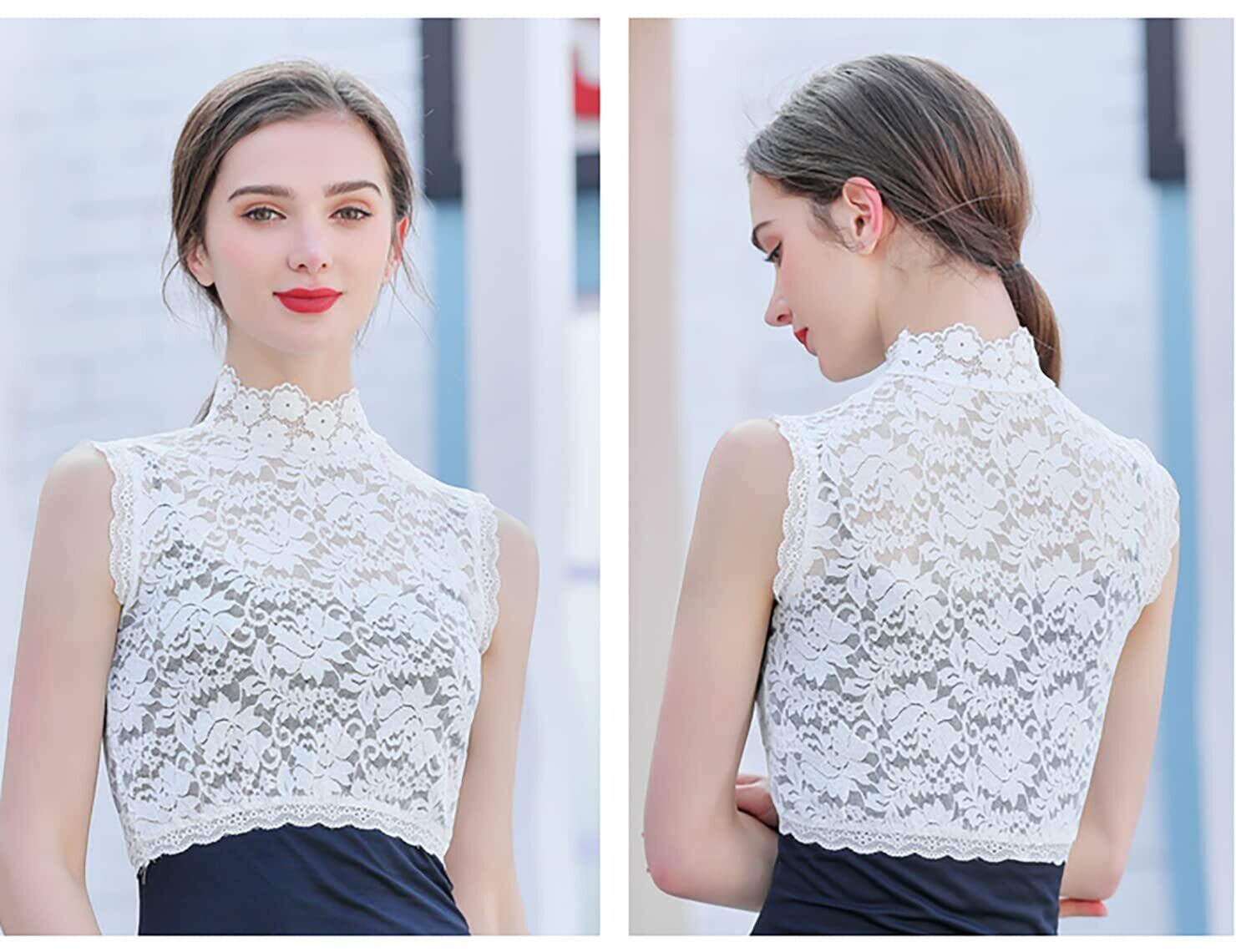 レース 付け襟 レディース ハイネック シャツ 重ね着 つけ襟 タートルネック レイヤード風 ブラウスシャツ レイヤード チュールレース 立て襟 襟付き 紫外線対策 ハイネックブラウス 立て襟 uvカット タンクトップ 薄手 (黒+白2枚セット, Free)