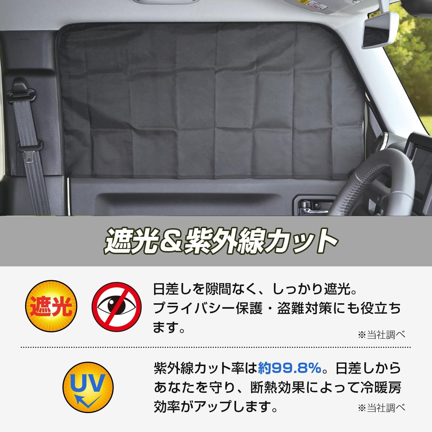 紫外線遮蔽率99.8% 遮光3級のカーテン生地を採用しておりますので、車中泊や車上荒らし対策、日焼け防止に最適なマグネットカーテンです。