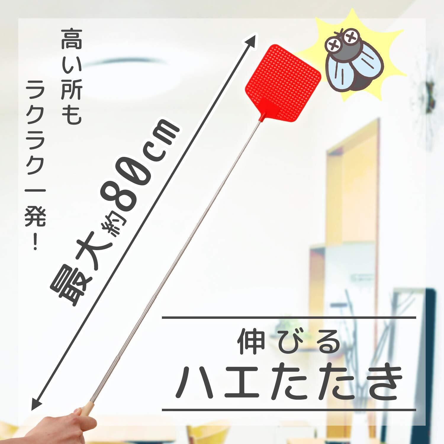コモライフ 伸びるハエたたき (最大80cm) 長い 伸縮 ハエ叩き 大きい 叩きやすい 高所 虫 蚊 コンパクト